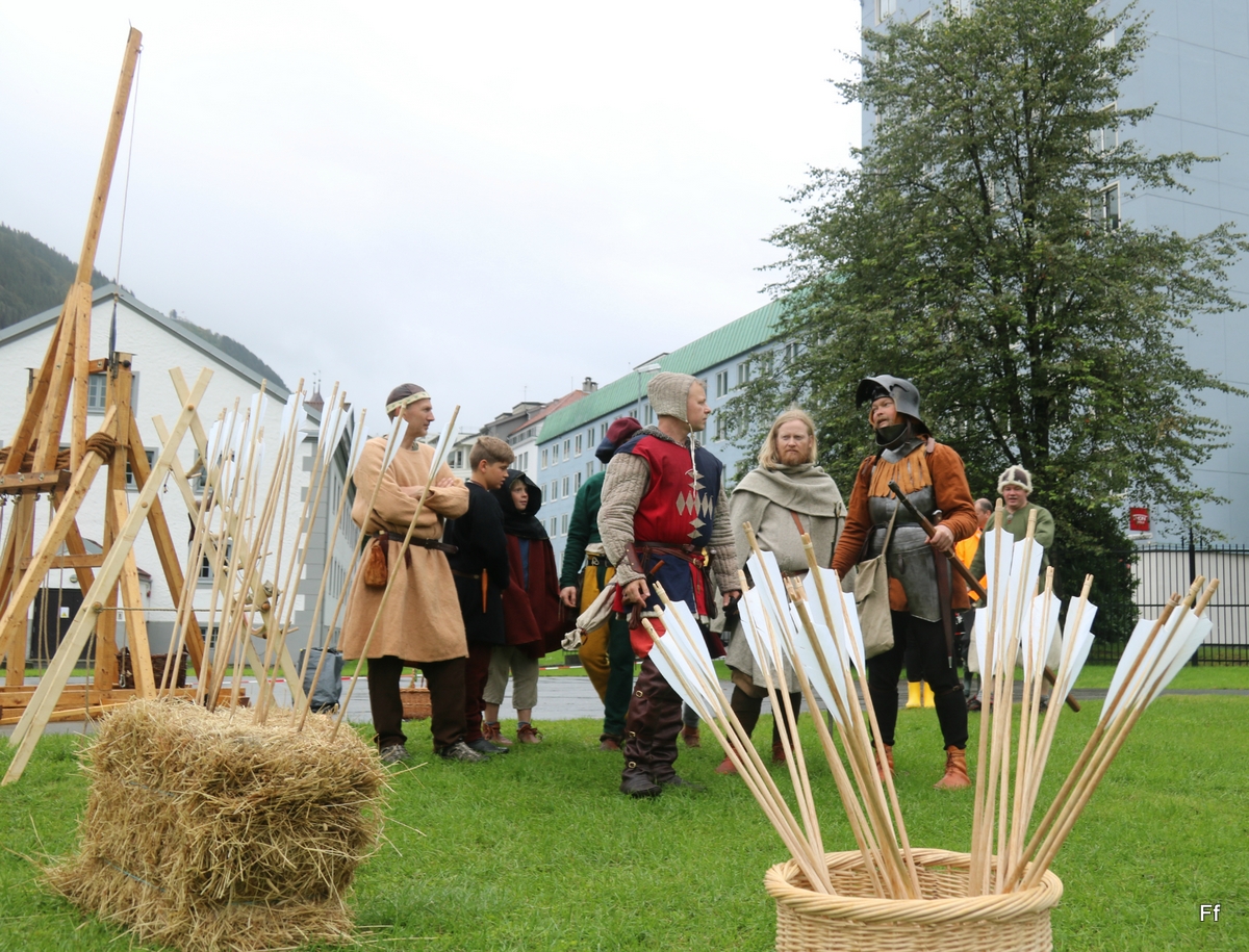 Bjørgvin Bogelag er en underavdeling av Handverkslaget, som har mange pil- og bueinteresserte. I fjor ble artillerioppvisningen derfor utvidet med pilregn. I år stilte tre medlemmer av Fortidsfamilien i skytterrekken. Malvin på 11 var stolt over å få være med som eneste barn. Han viste på trening at han kunne skyte like langt som de voksne. Pilregn fra 2014