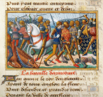 Henry V flanked by 15-16th Century illustrations of the battle of Agincourt