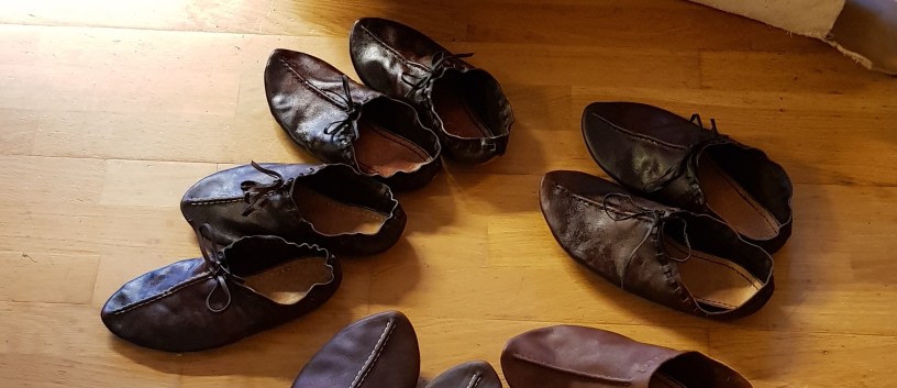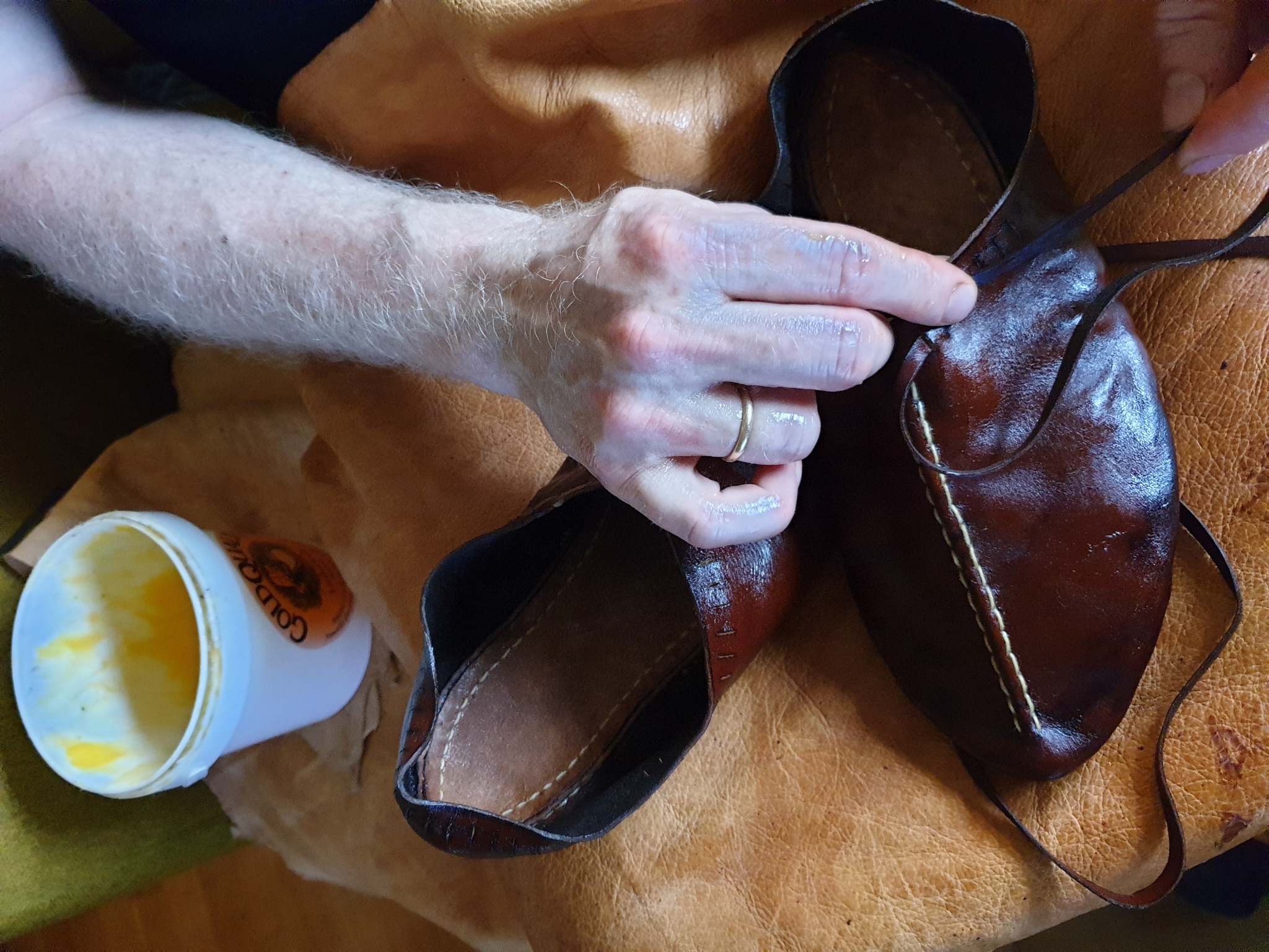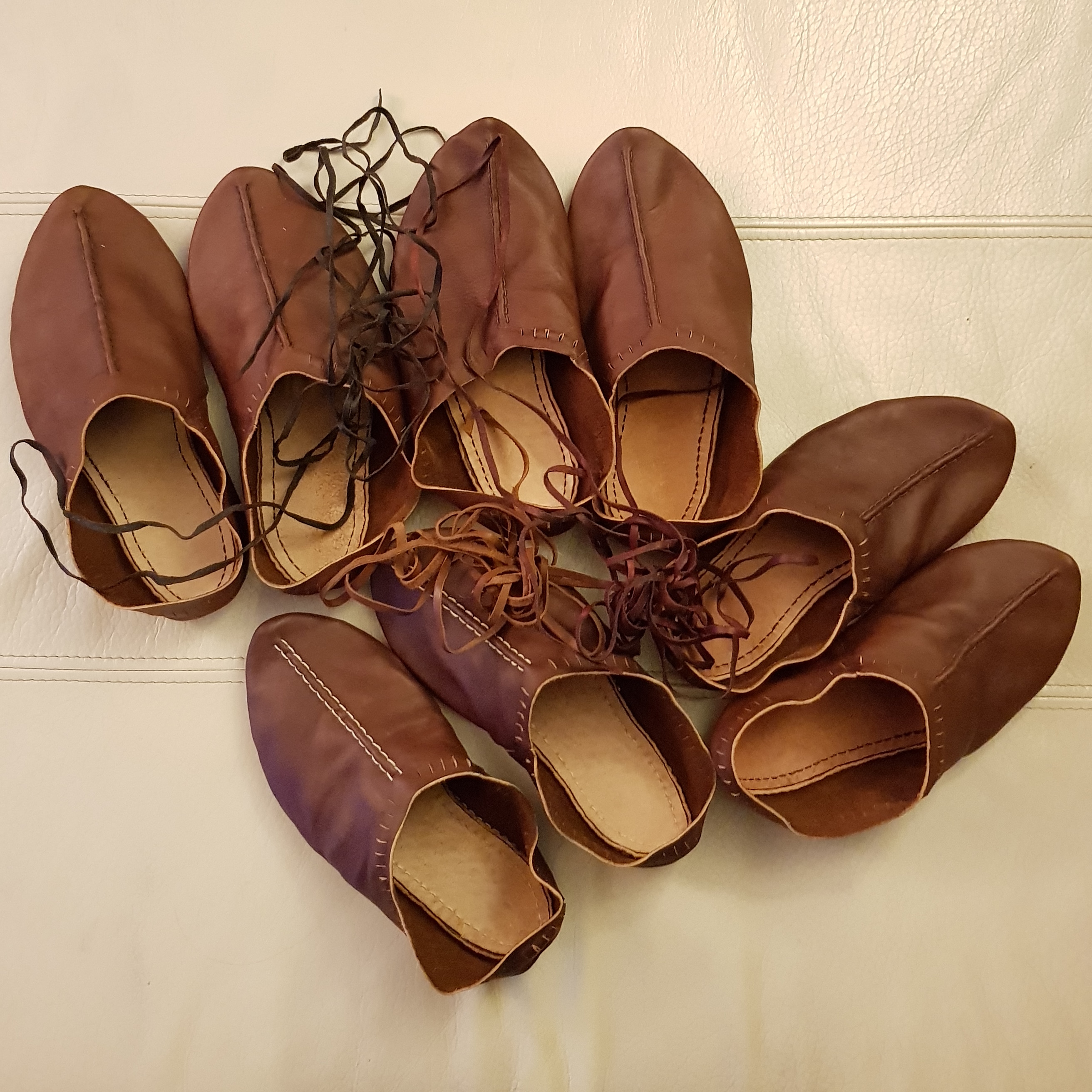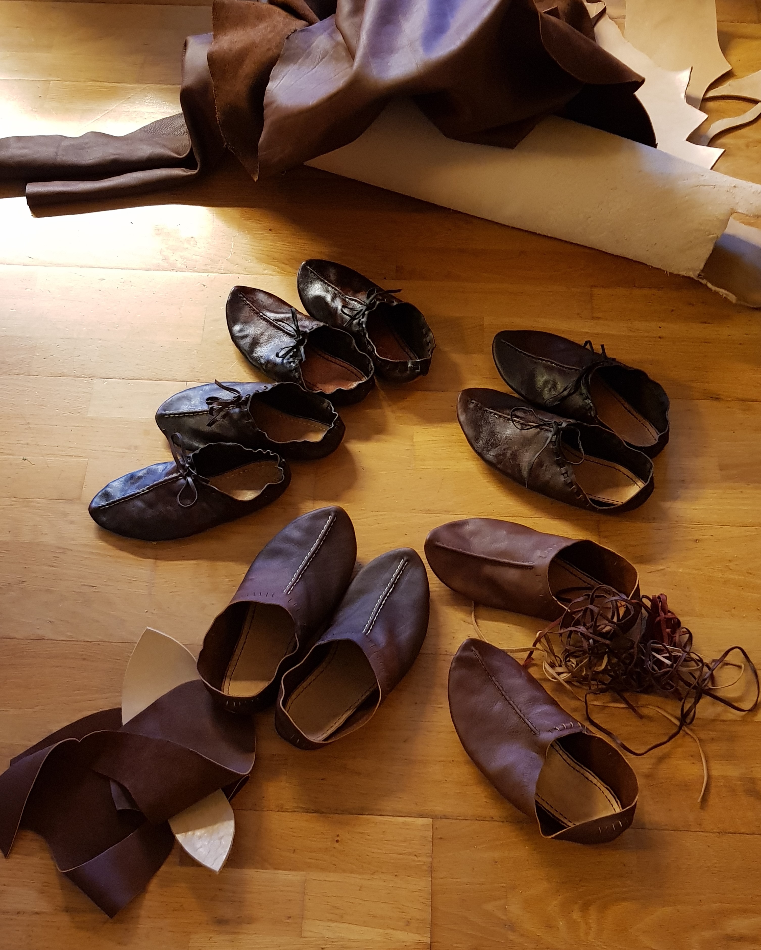 Vareutvalget vårt omfatter imidlertid også vikingtid om noen skulle være bekymret for at vi var gått helt i middelalderen. Det er enkle Hedeby-reimstøvler som har vært mest etterspurt de siste årene, og Espen har satset mest på disse i år også, i flere ulike størrelser. Det blir også noen sko av andre typer, både fra vikingtid og middelalder. Litt variasjon er ikke å forakte, både for Espen sin del, men også for det helhetlige bildet. Det er jo kjedelig om alle skal gå rundt i helt like sko.