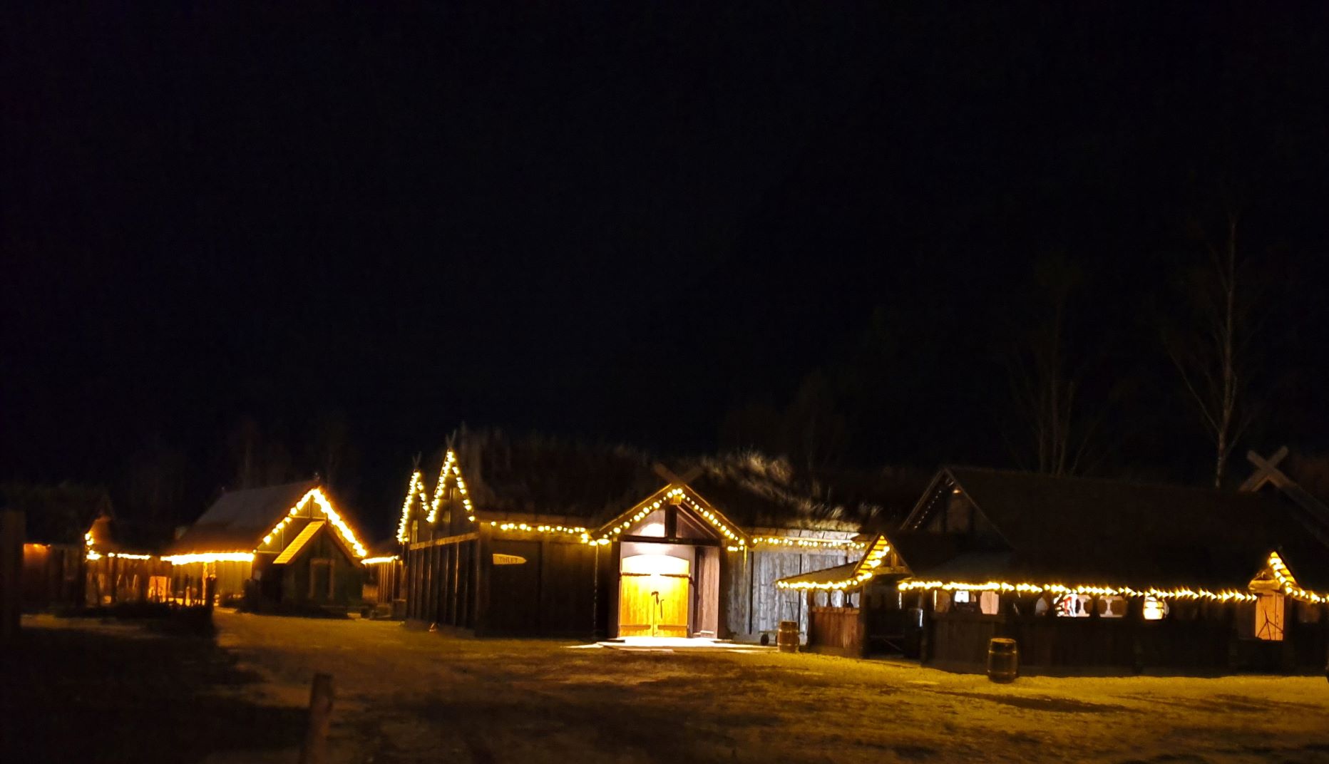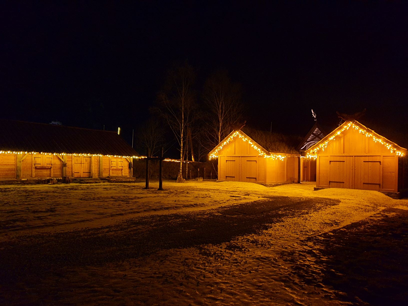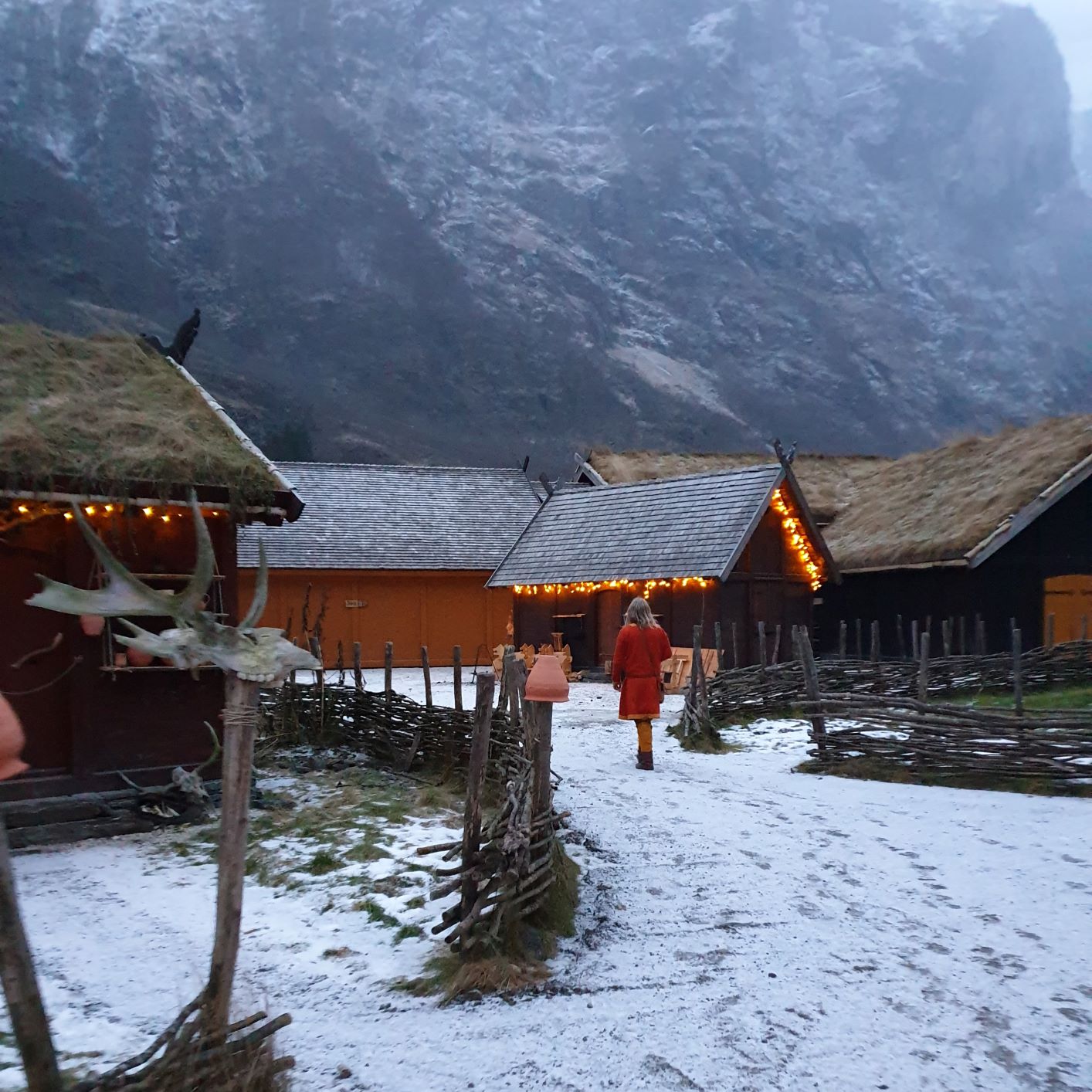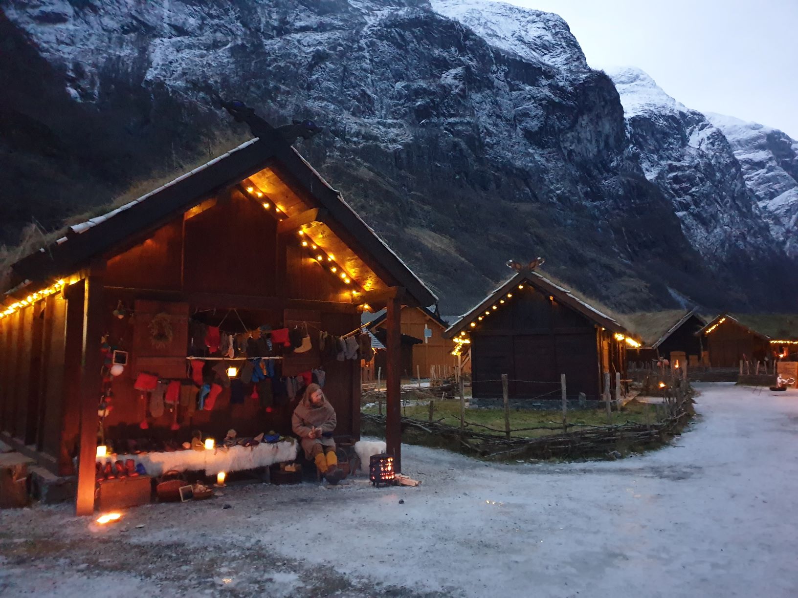 Markedet fulgte vikingbyens åpningstider, og stengte kl. 18:00. Hele Vikingbyen var pyntet med julelys langs gavler og kanter, slik at det ble riktig koselig når mørket falt på, og det gjorde det tidlig, allerede i firetiden. Det ble skikkelig julestemning mellom de høye fjellene i verdensarvområdet, men samtidig så mørkt av vi måtte flytte varene inn og forsøkte å lyssette dem der de siste par timene. De moderne utstillerne hadde sine boder i den oppvarmede og lyssatte hallen Heidrun, så flesteparten av markedsgjestene strenet direkte inn dit i mørket.