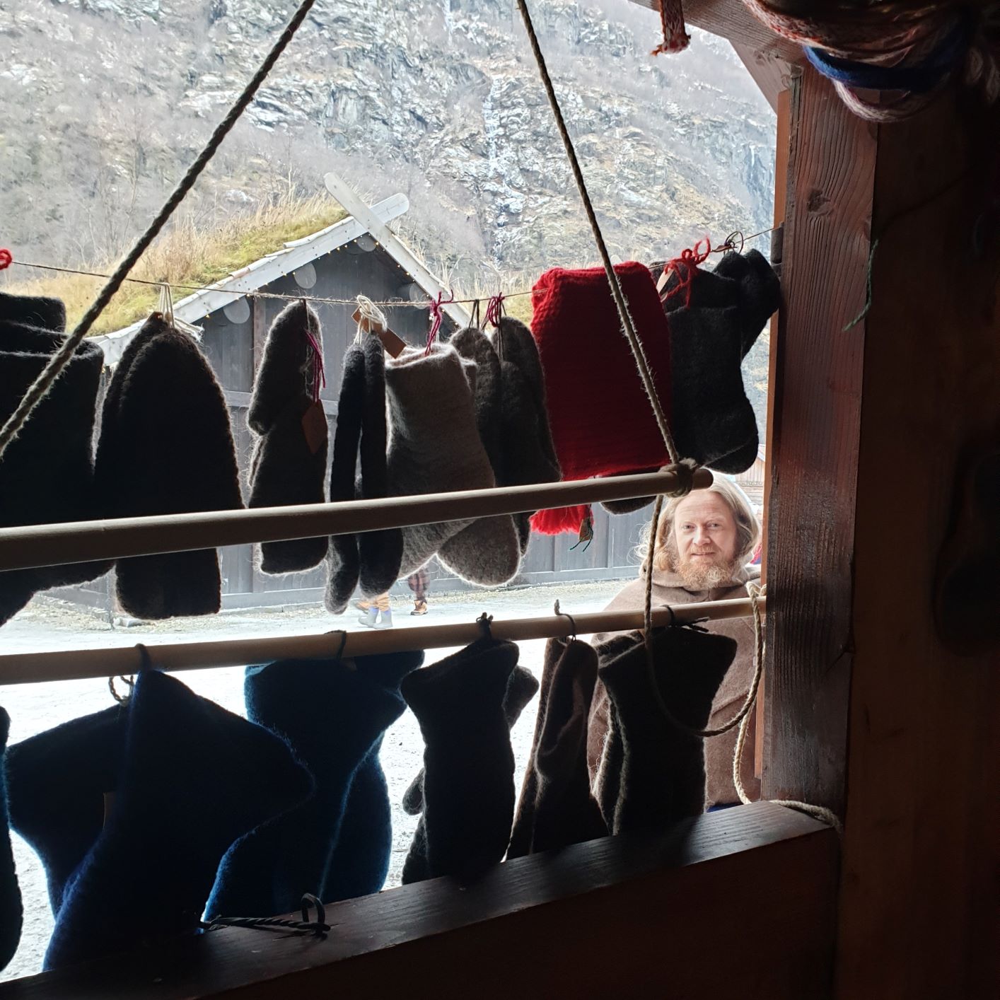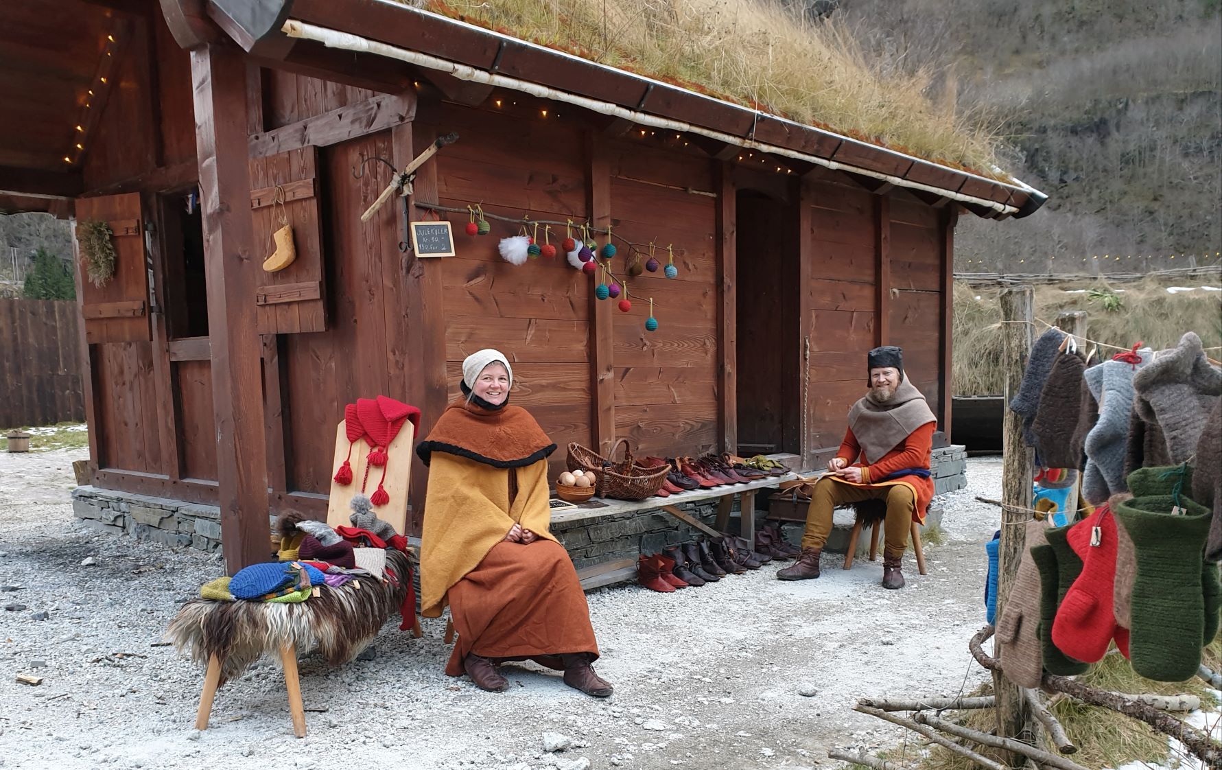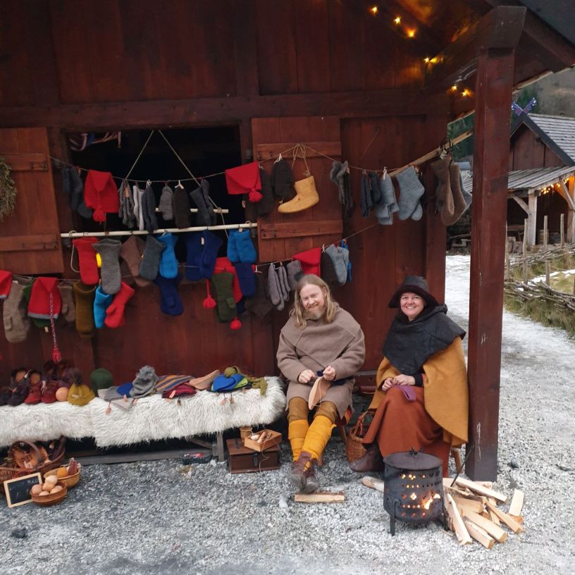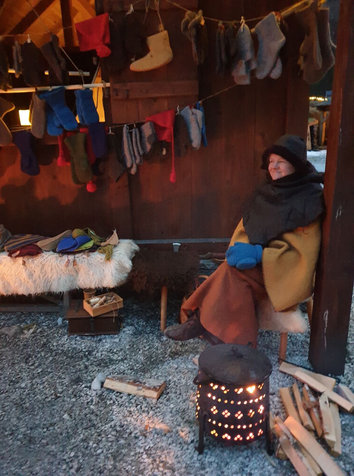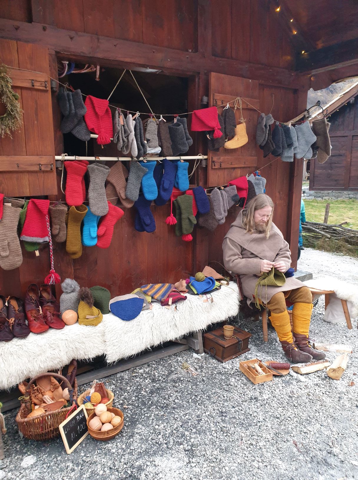 Outside, the landscape was covered with a thin, wet drizzle of snow and sleet, and some rainfall was expected throughout the day. We therefore arranged our goods a little differently than the day before, on the gable wall and in the window, under the small, projected roof of our house. There were also Christmas lights in the gable, so it became really Christmas-like and cozy when our colourful woolen goods decorated the facade. It was a bit sour weather that day, and we are so happy that we were allowed to borrow Viking Chief Georg’s portable stove to warm us up.