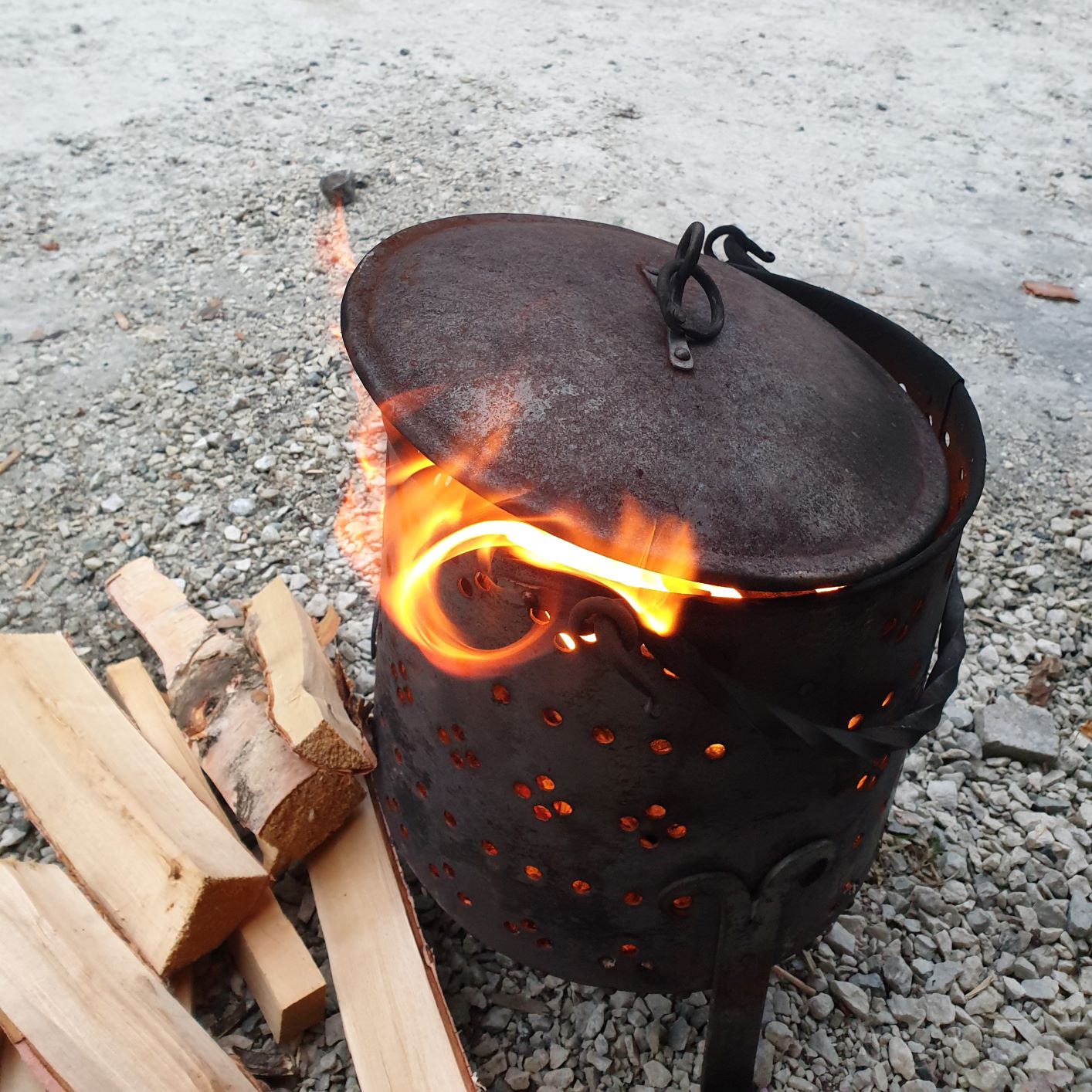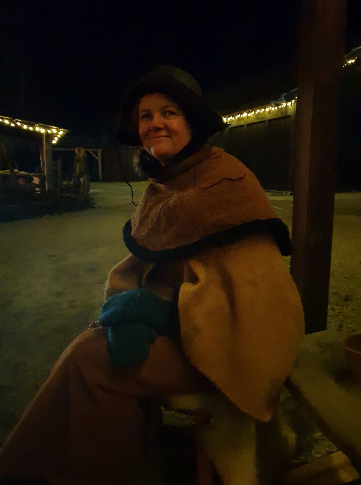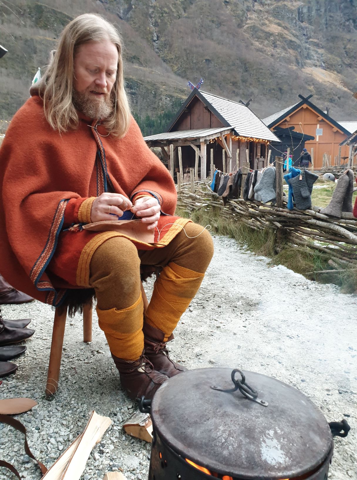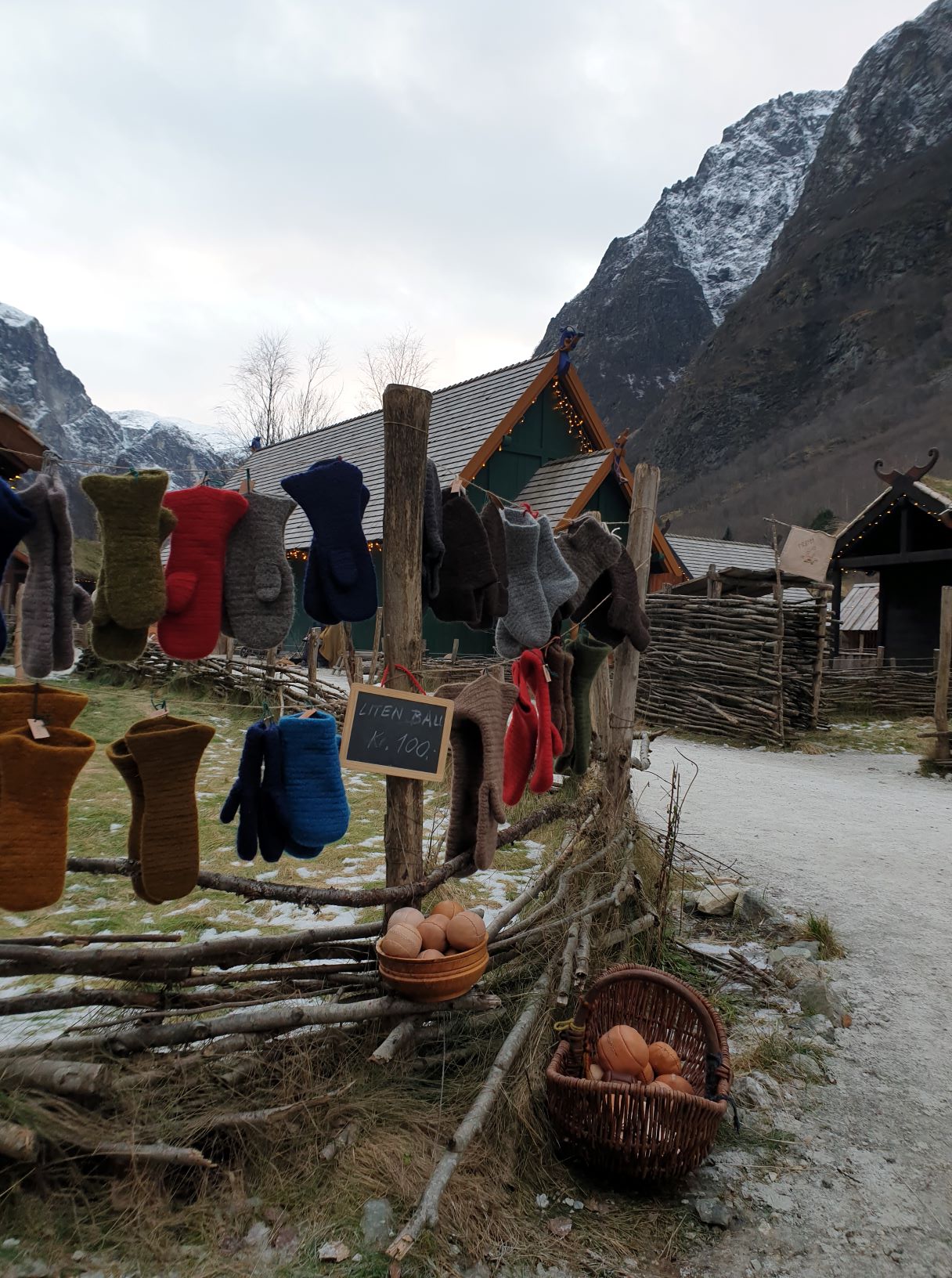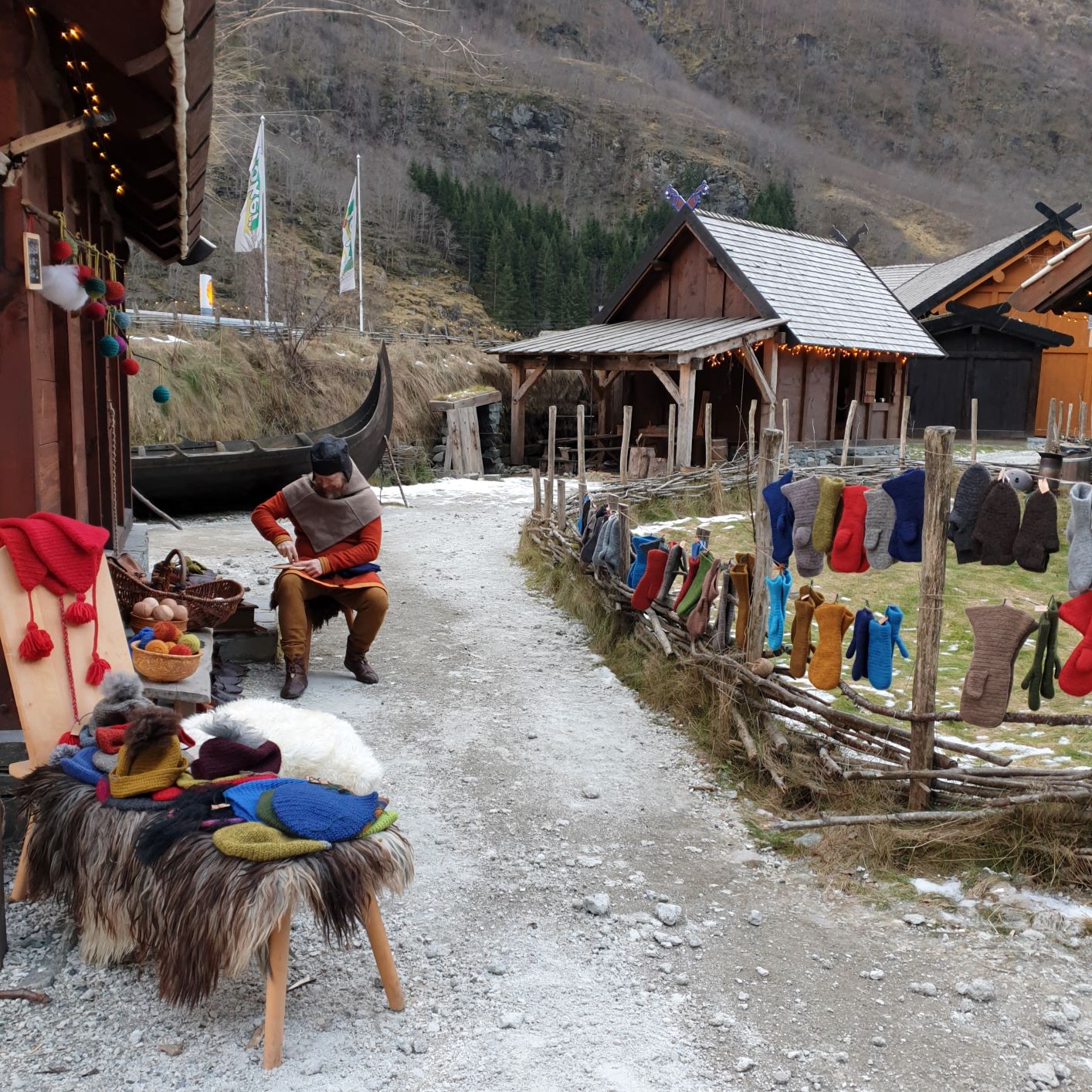 Outside, the landscape was covered with a thin, wet drizzle of snow and sleet, and some rainfall was expected throughout the day. We therefore arranged our goods a little differently than the day before, on the gable wall and in the window, under the small, projected roof of our house. There were also Christmas lights in the gable, so it became really Christmas-like and cozy when our colourful woolen goods decorated the facade. It was a bit sour weather that day, and we are so happy that we were allowed to borrow Viking Chief Georg’s portable stove to warm us up.