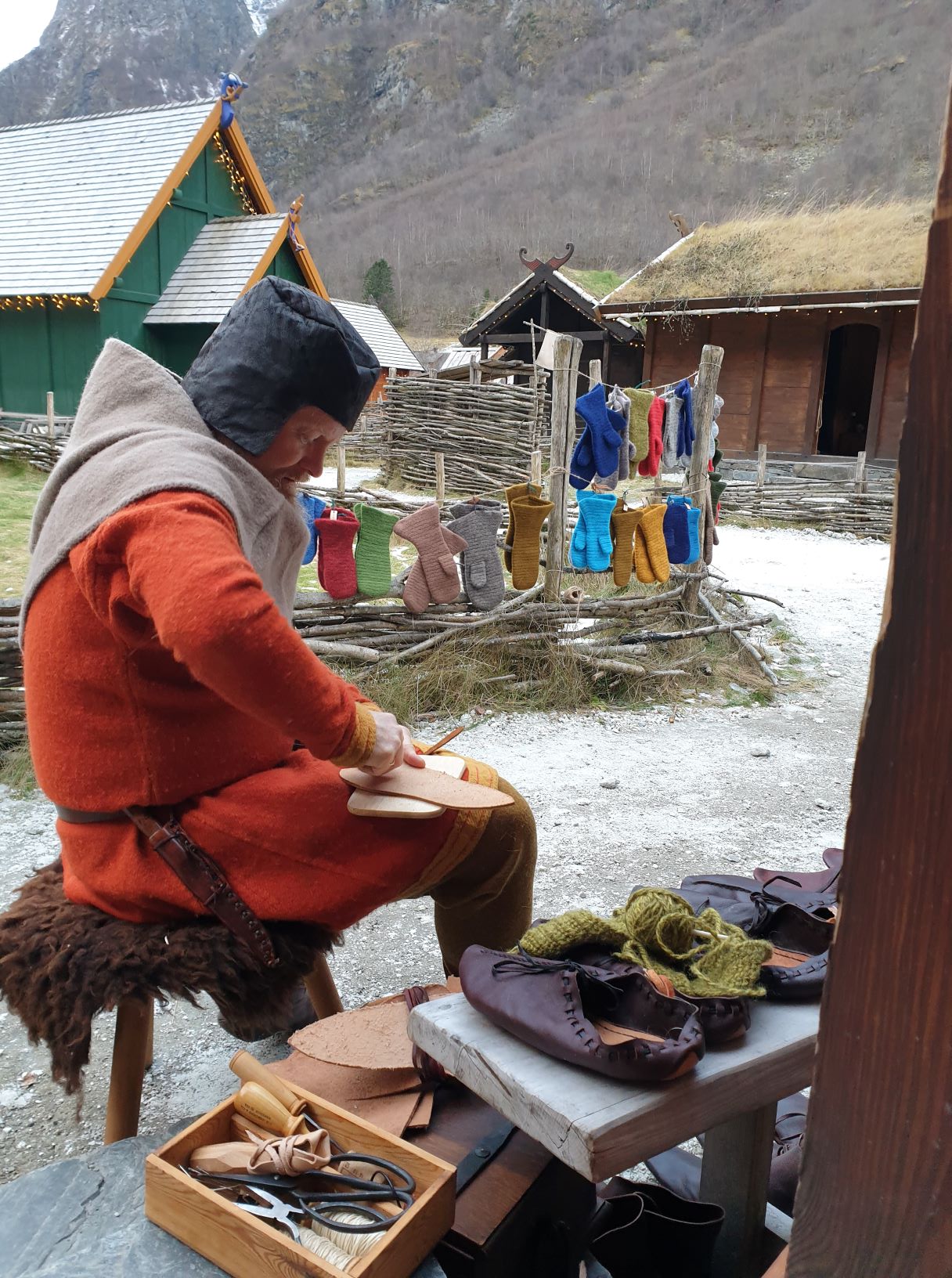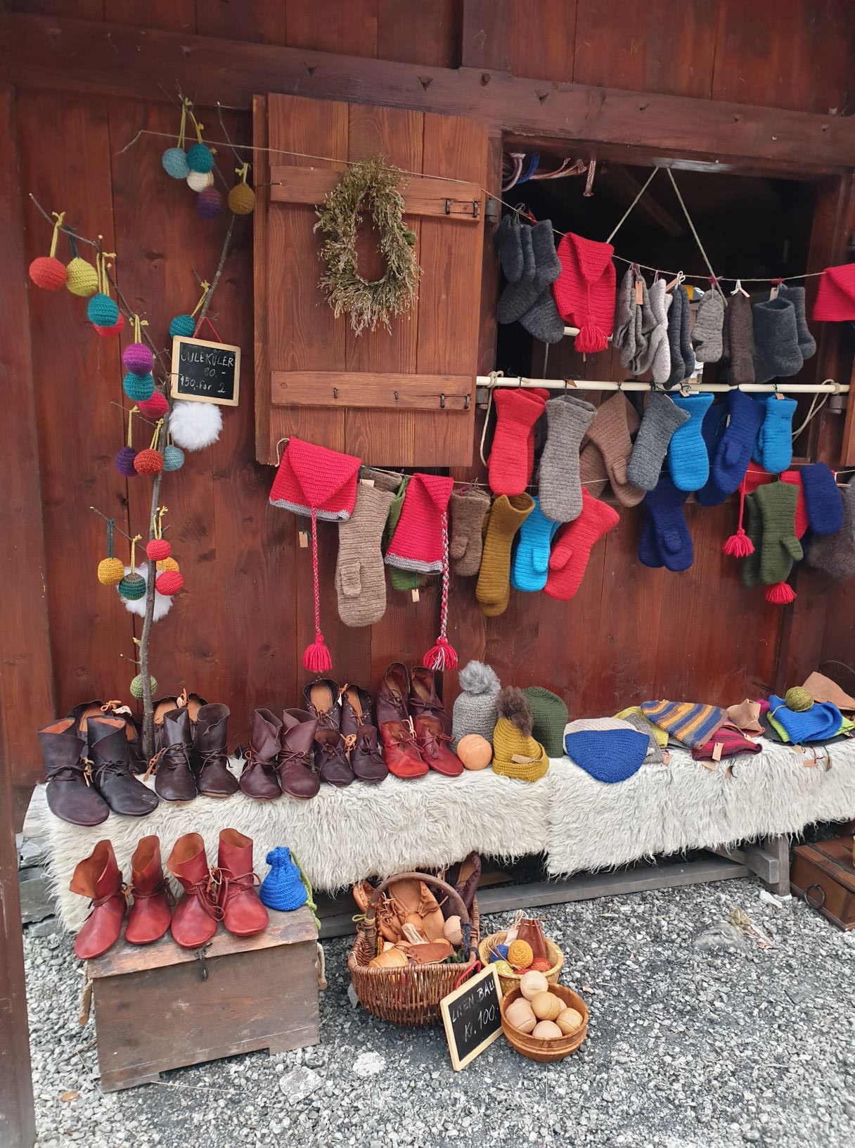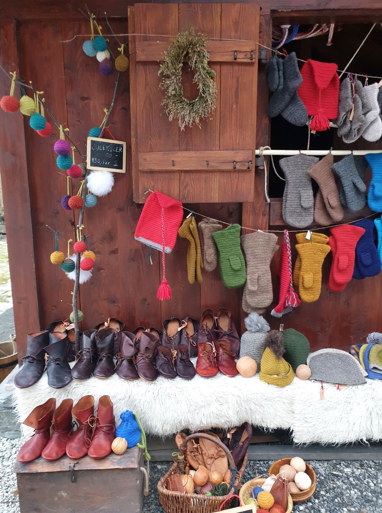 We always take it seriously when we are on our time travels, but given the fact that this was a Christmas market, we allowed ourselves a few tiny, anachronistic and non-historical antics. After all, the market also had modern exhibitors with products from our own time. The visitors, our customers, were also mainly non-Vikings, hence we needed to bring along more than just historical goods. Since it is winter and cold, we brought with us a great number of needle-bound mittens, hats and socks, including some with a bit more contemporary look. Lena had also dared to make needle-bound Christmas balls of leftover yarn, filled with fur from sheepskin, to have some smaller items for sale. Another new product type this year was small leather balls, based on findings from York. Espen also brought along his shoemaking equipment to show and tell how shoes are made, and he also sold a few pair of boots to some fellow Vikings.