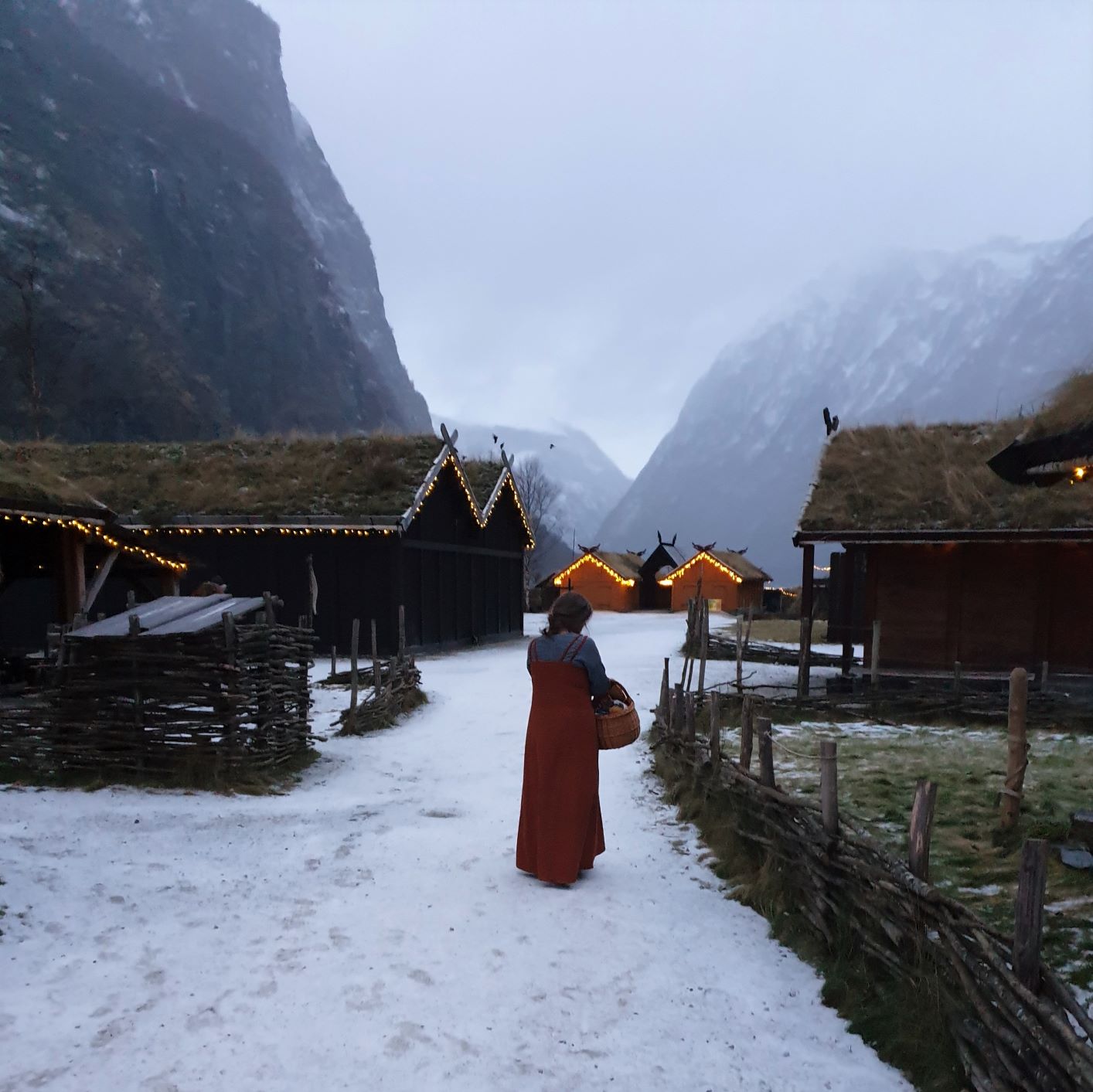 Når vi er i Gudvangen ønsker vi selvsagt å bo i de flotte små husene, også når det er vinter, og selv om de ikke er oppvarmet. Ved å pakke oss godt inn i feller og pledd, klarte vi å holde varmen. Den første natten våknet vi riktignok av at vi var litt kalde, fordi en del av teppene og fellene hadde havnet på gulvet.