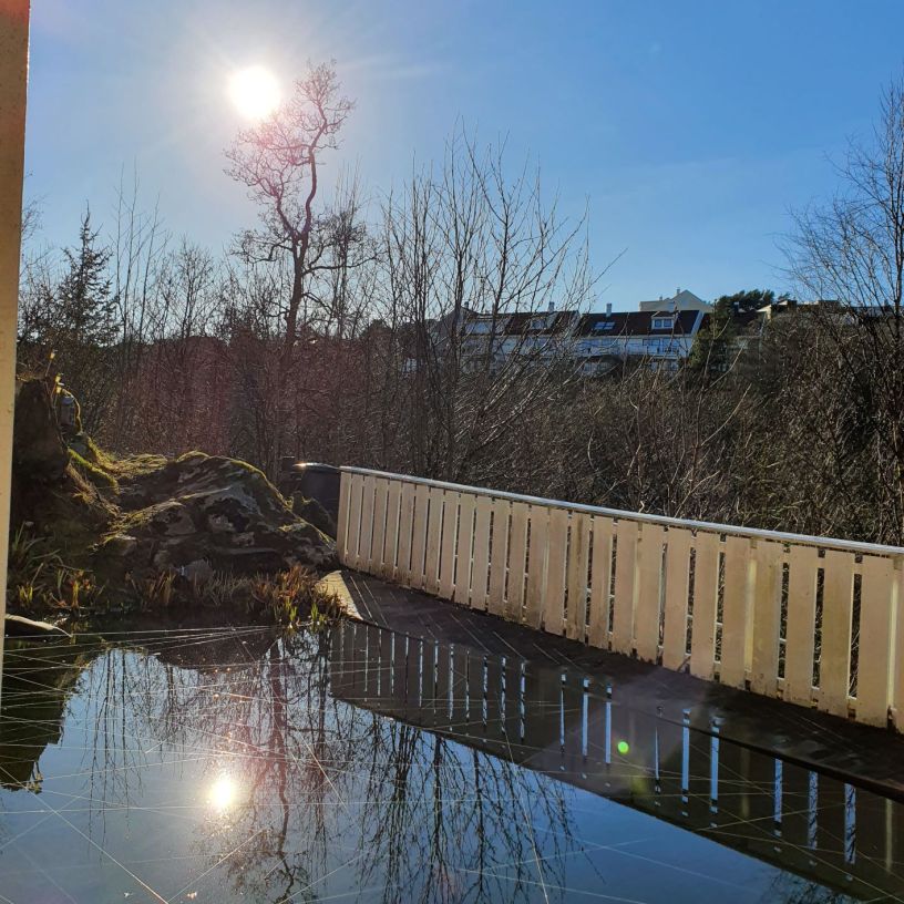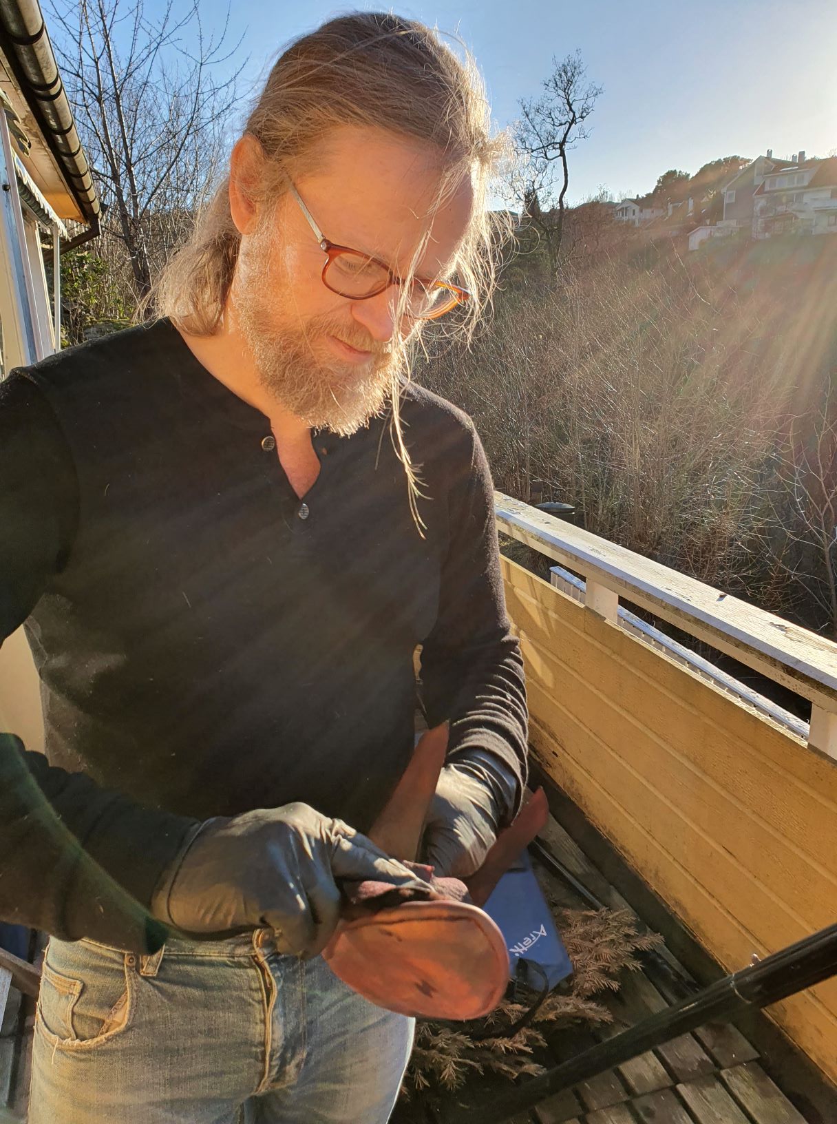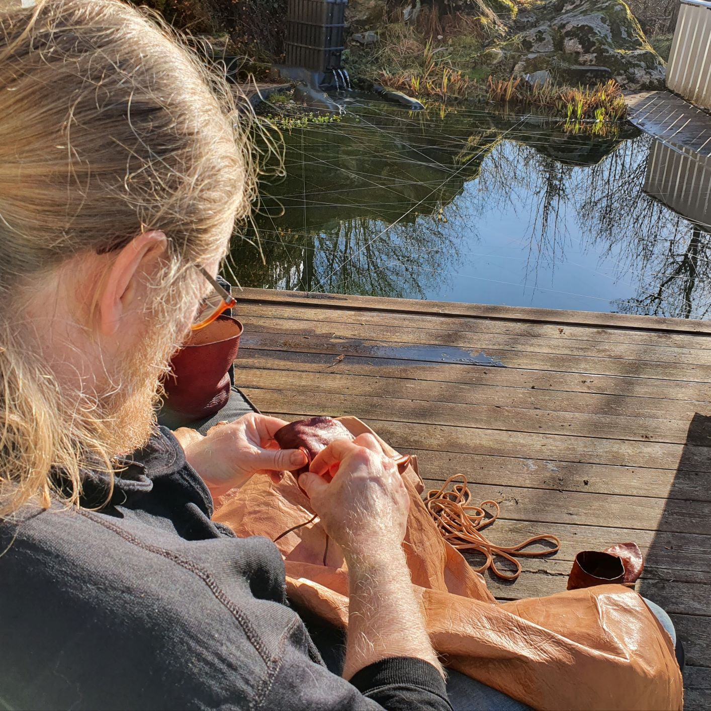 Our leisure interests are also affected. We can no longer meet our good crafting friends in Bjørgvin Handverkslag on Tuesday evenings, and several of our joint projects must be postponed. Fortunately, we can still do historical crafts, both in the evenings after work hours and during the weekends. It is good to have something to keep our fingers occupied when we hardly get a change of scenery. Luckily, it has been nice and spring-like weather the past couple of days, and this weekend we broght out the garden furniture and did some crafting in the sunshine on the terrace by our fishing pond.