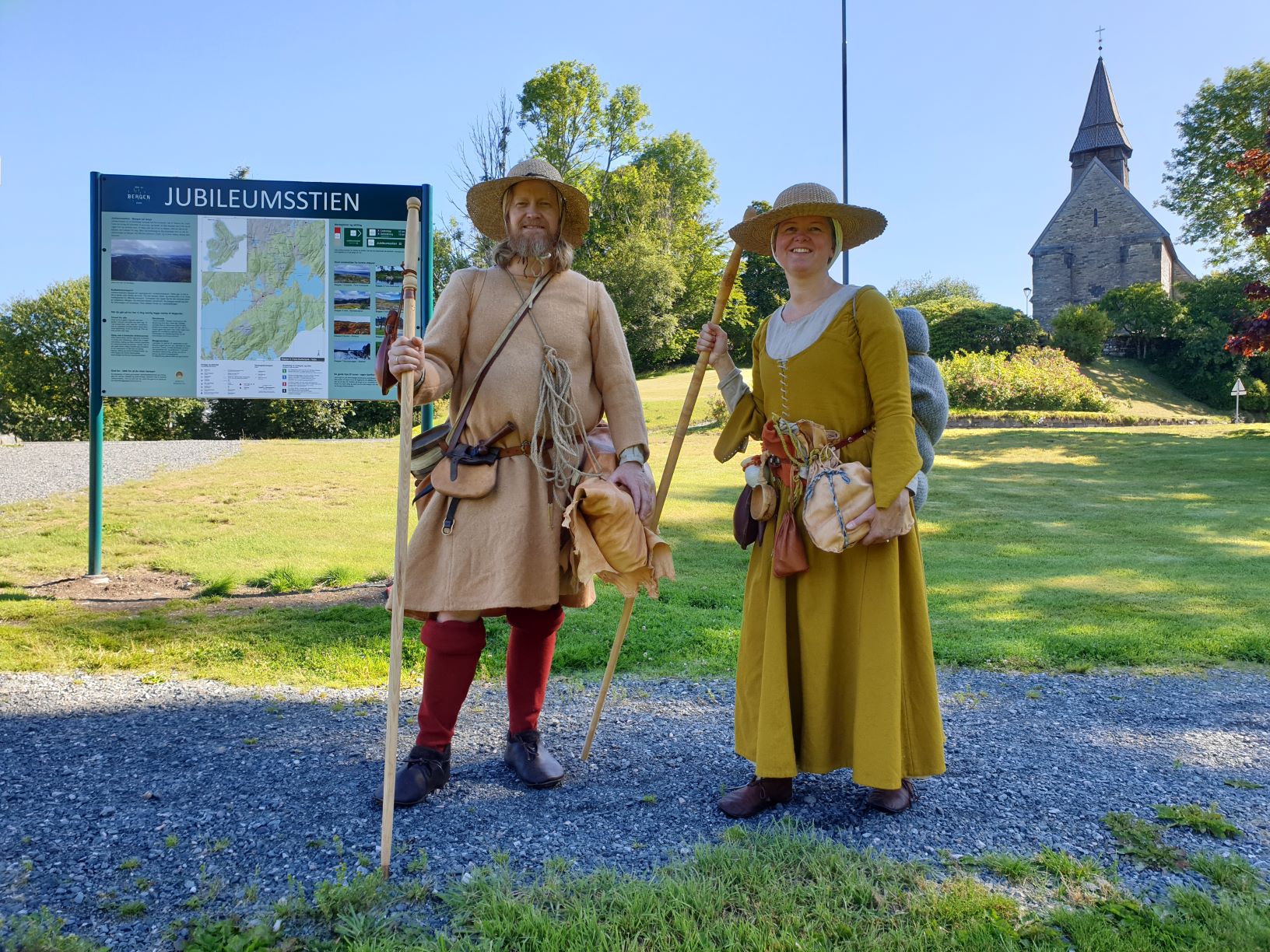 Valget falt på Jubileumsstien, som ble merket opp som en del av Bergens 950-årsjubileum. Egentlig begynner stien på Krokeide, men vi syntes at det passet å starte på vår hjemmebane Hordamuseet i stedet. Siden vi valgte et pilegrimsuttrykk, var det naturlig å slå inn på stien ved Fana kirke, som med sitt helbredende sølvkors, var et kjent valfartssted i middelalderen. Her gikk også den gamle grensen mellom Sunnhordland og Nordhordland.