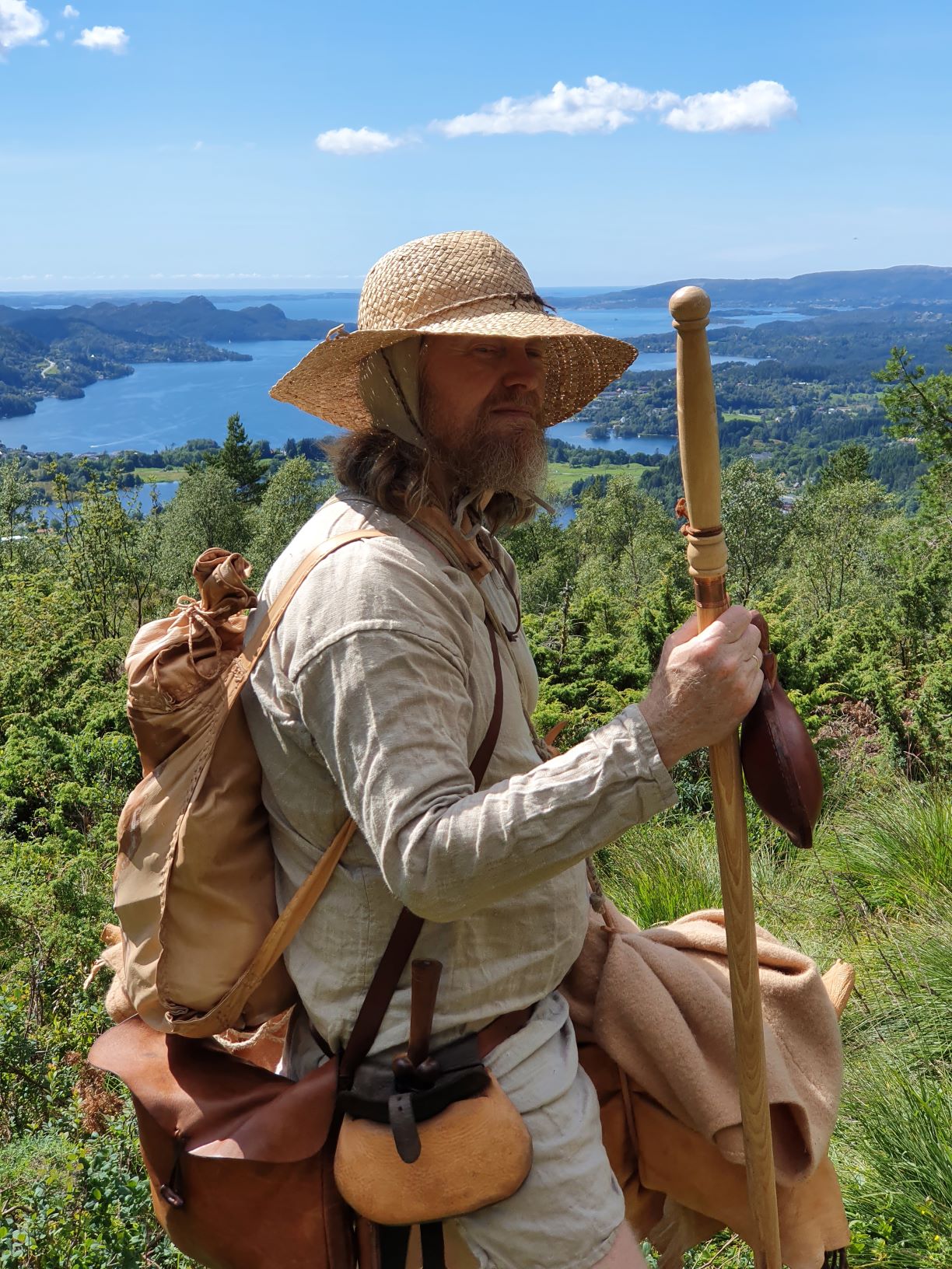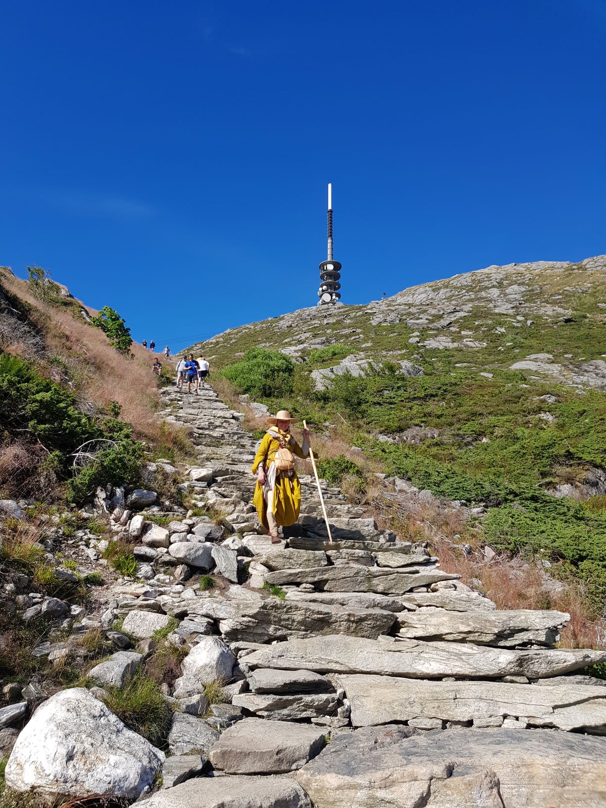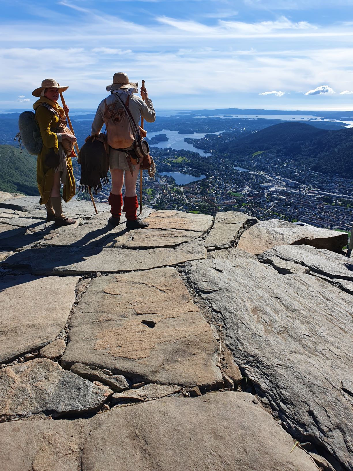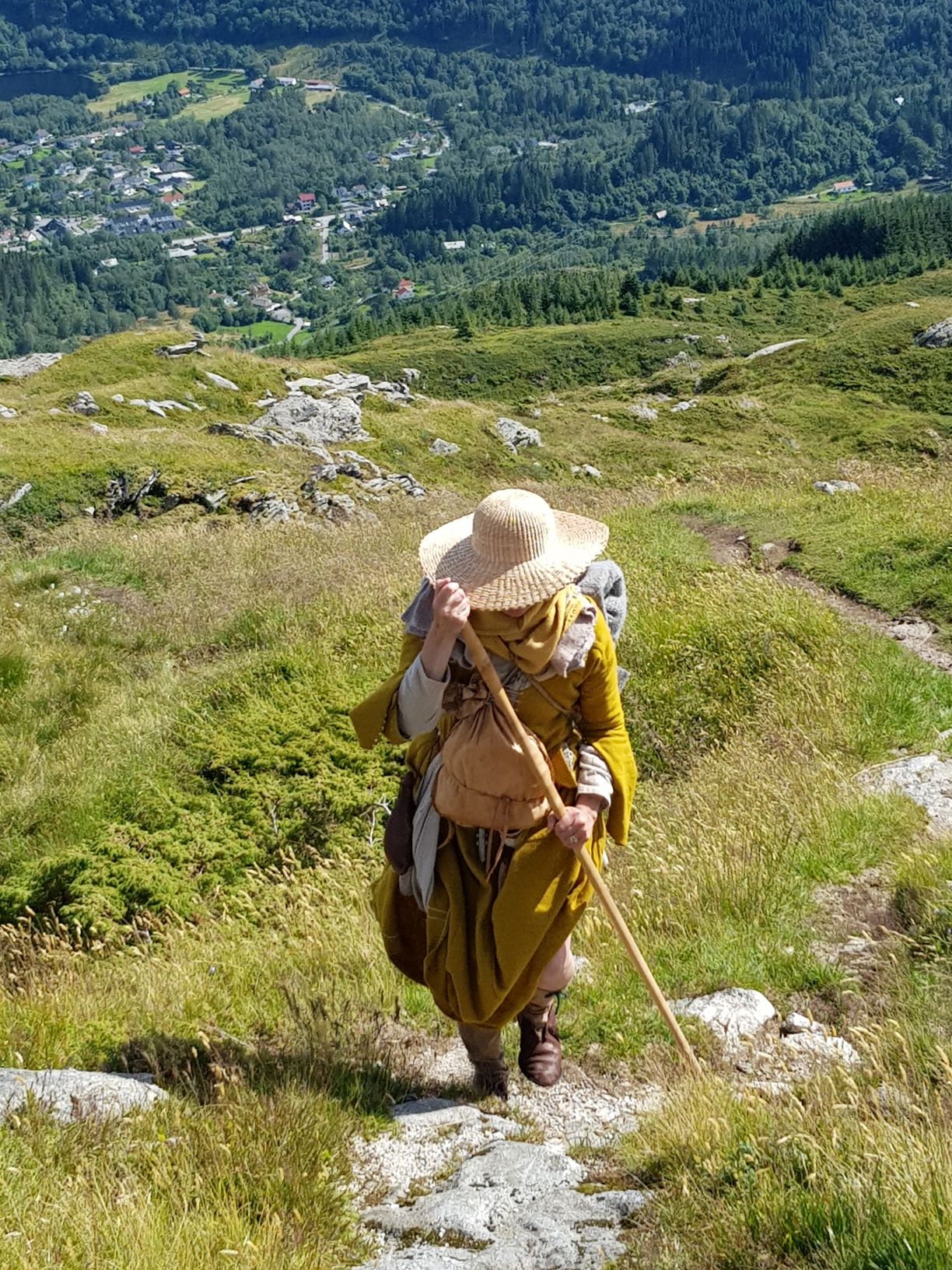 The next day we walked for about 15 km, a shorter, but heavier trip. The first part of the day was up the steep hills to 674 meters above sea level. Due to bad weather forecasts we decided to end the trip after two days, and headed home via mount Ulriken, and down the stone stairs to Bergen. All in all we walked about 39 km. Not much by today’s standards, but remember we carried heavy loads and used authentic clothes and footwear, so it is not comparable to a hike with modern equipment. Thank goodness for the pilgrim’s staffs, which supported us over bogs and up and down the steep trails.