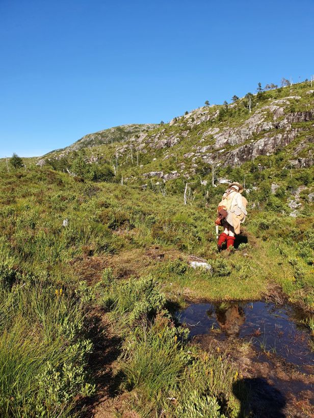 We both had horsehair insoles in our shoes. It probably provides a little cushioning, but first and foremost they protect the feet from moisture and cold. The shoes were heavily greased, and therefore reasonably water-repellent. We both used shoes with rand, that is a leather strip between the sole and the upper, which protects the seam, and in addition keeps water from leaking in. A good choise, as the terrain we walked through was very wet. Without the rand, the sole seam could also easily have been damaged by sharp stones and twigs, of which there were many. We stayed dry on our feet for a long time, but when you walk for miles and hours in marshy terrain, sooner or later you will get water over the edges of your shoes. Finally, you don’t care, and march through marshes and streams. Higher shoes, or even boots, would have been preferable, which is noted until next time. At least we were happy that we had shoes with front lacing, and not side lacing.