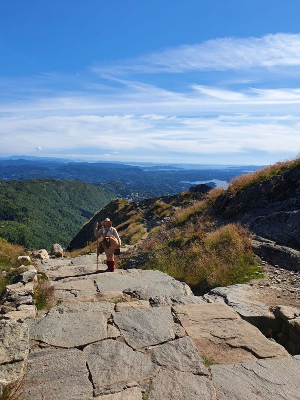None of us suffered any injuries or ailments, despite the intimate relationship we had with the surface we walked upon. It was most unpleasant to walk on the barren mountain, on large rocks and rough, hard ground, and of course the ca. 1500 steps down from Ulriken. None of us got any blisters, since the shoes were soft and pliable, but the feet became a little swollen. It seems that Lena’s thin shoes worked just as well as Espen’s heavy shoes, at least on a summer trip like this. We never got to use our shoe repair kit nor the extra shoes we brought along.