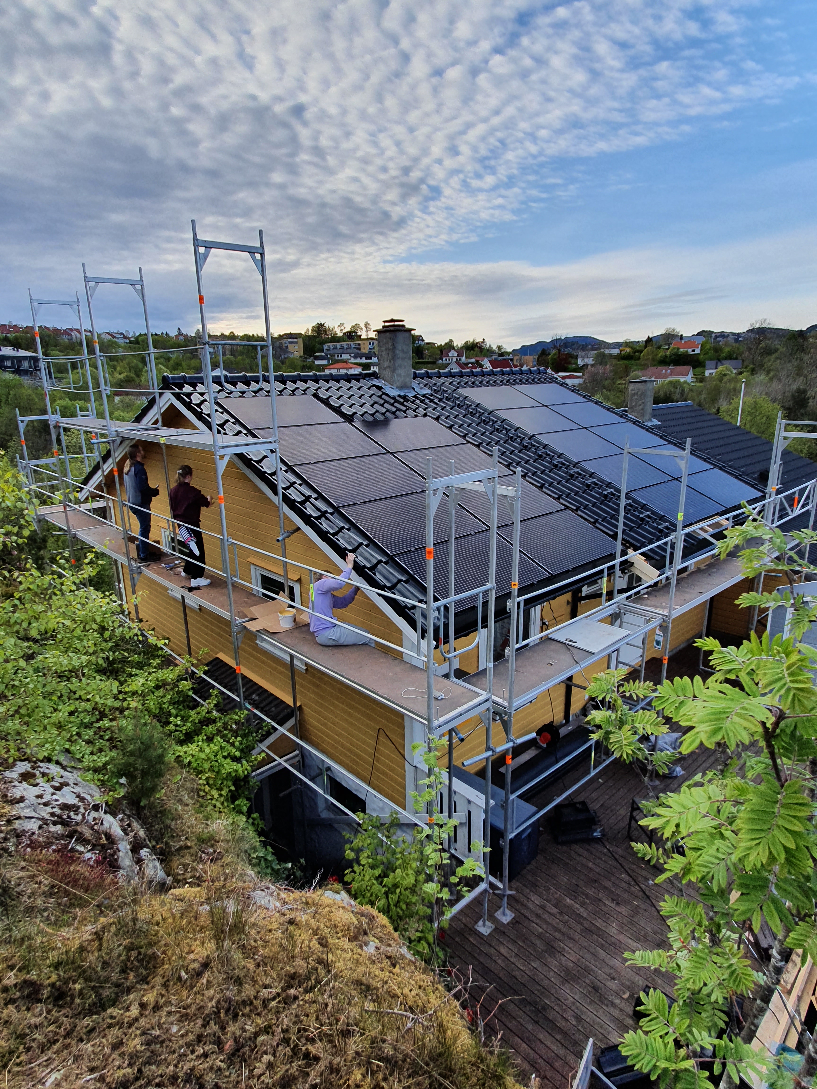 Ut i april gikk vi etter hvert mest over til å produsere historiske klær og utstyr til oss selv. Lena havnet etter hvert også på strikkekjøret, med Jørgen Jæger-luer, Kystsogegenser og andre større og mindre prosjekter. Som mange andre i disse koronatider brukte vi mye av fritiden vår på å pusse opp og male hus i vår og sommer. Da ble søm og lærarbeid i en periode fortrengt av snekring og maling. Det største løftet var nytt tak med solceller, men det krevde ekte fagfolk og håndverkere.