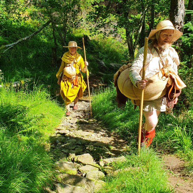 I juli gikk vi en liten pilegrimstur i skog og fjell rundt Bergen, med kun middelaldersk utrustning. Vår yngste sønn var med som fotograf, og tok mange fine solskinnsbilder av sine middelalderforeldre. Da fikk vi brukt en del av klærne og utstyret som vi laget på våren.