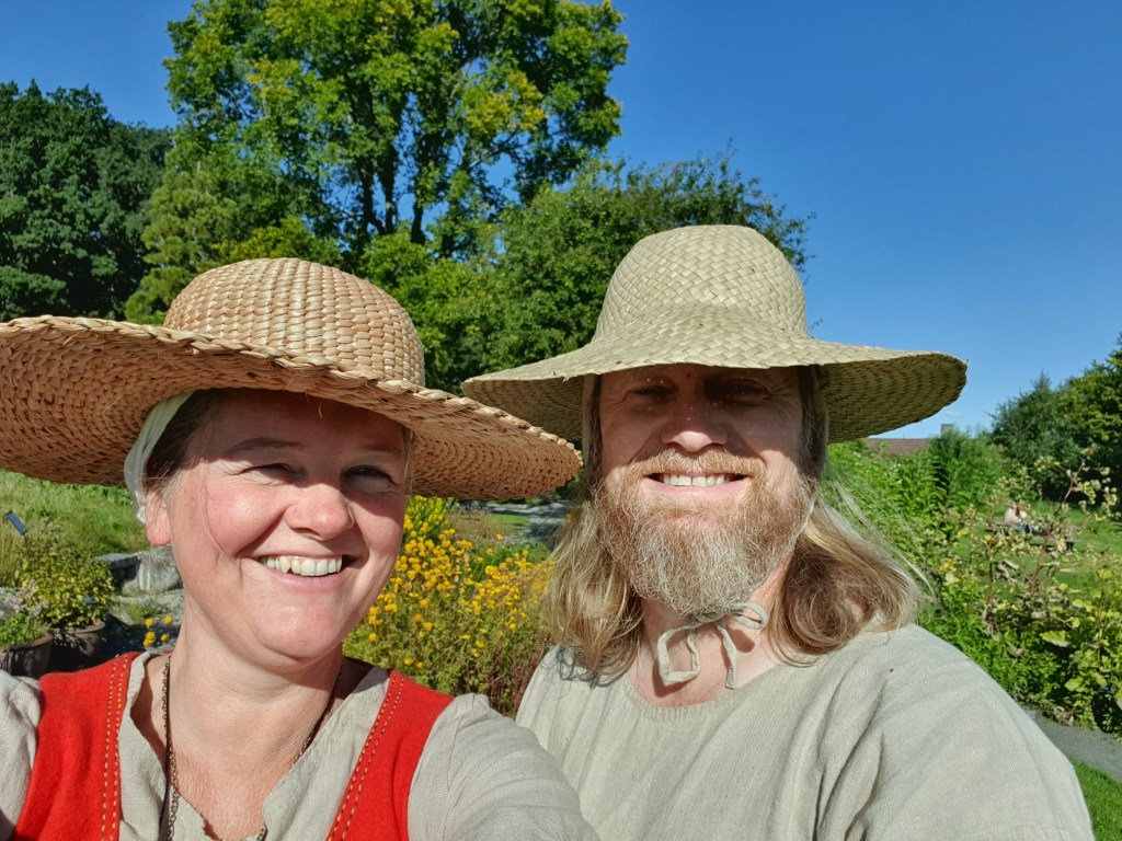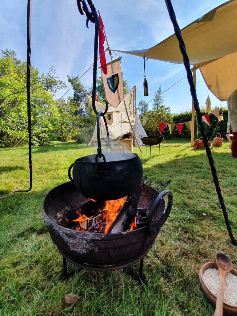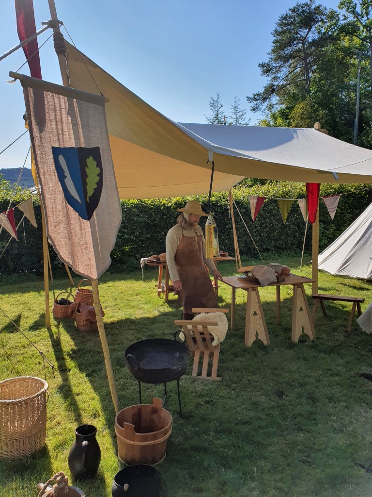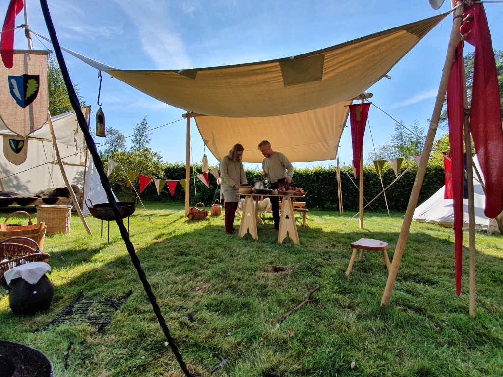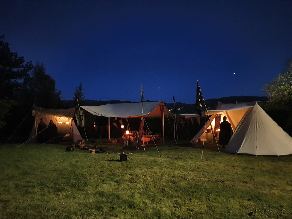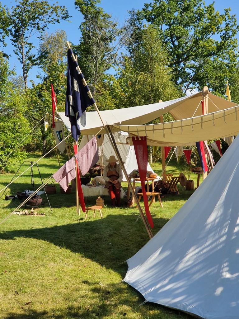 Det ble ingen historiske festivaler på oss i år heller, ettersom alle vi hadde tenkt oss på ble avlyst. Bjørgvin Marknad ble først utsatt til august, før det endelig ble avlyst. Hva gjør man når man er underernært på historiske festivaler? Helgen 27.-29. august dro vi på glamping i en hage på Milde, og slo leir sammen med våre venner Stig og Han Mei. Vi rigget oss til med både telt og solseil, møbler og vimpler, laget mat, drev håndverk og gikk tur i skogen.