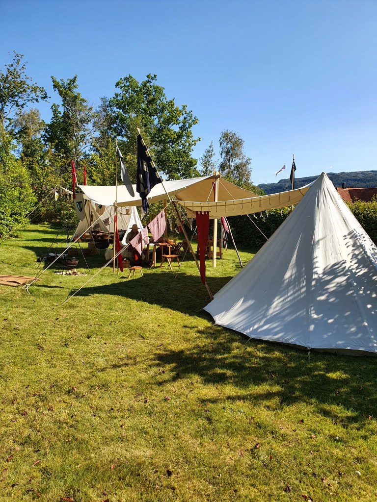 No historical festivals and markets for us this year either, as every event we had in mind were canceled. Bjørgvin Marknad was first postponed until August, before it was finally canceled. What to do when malnourished on historical festivals? The weekend 27th-29th of August we went glamping with our friends Stig and Han Mei in a garden at Milde outside Bergen. We equipped ourselves with both tents and tarps, furniture and pennants, made food, crafted and went for a hike in the woods.