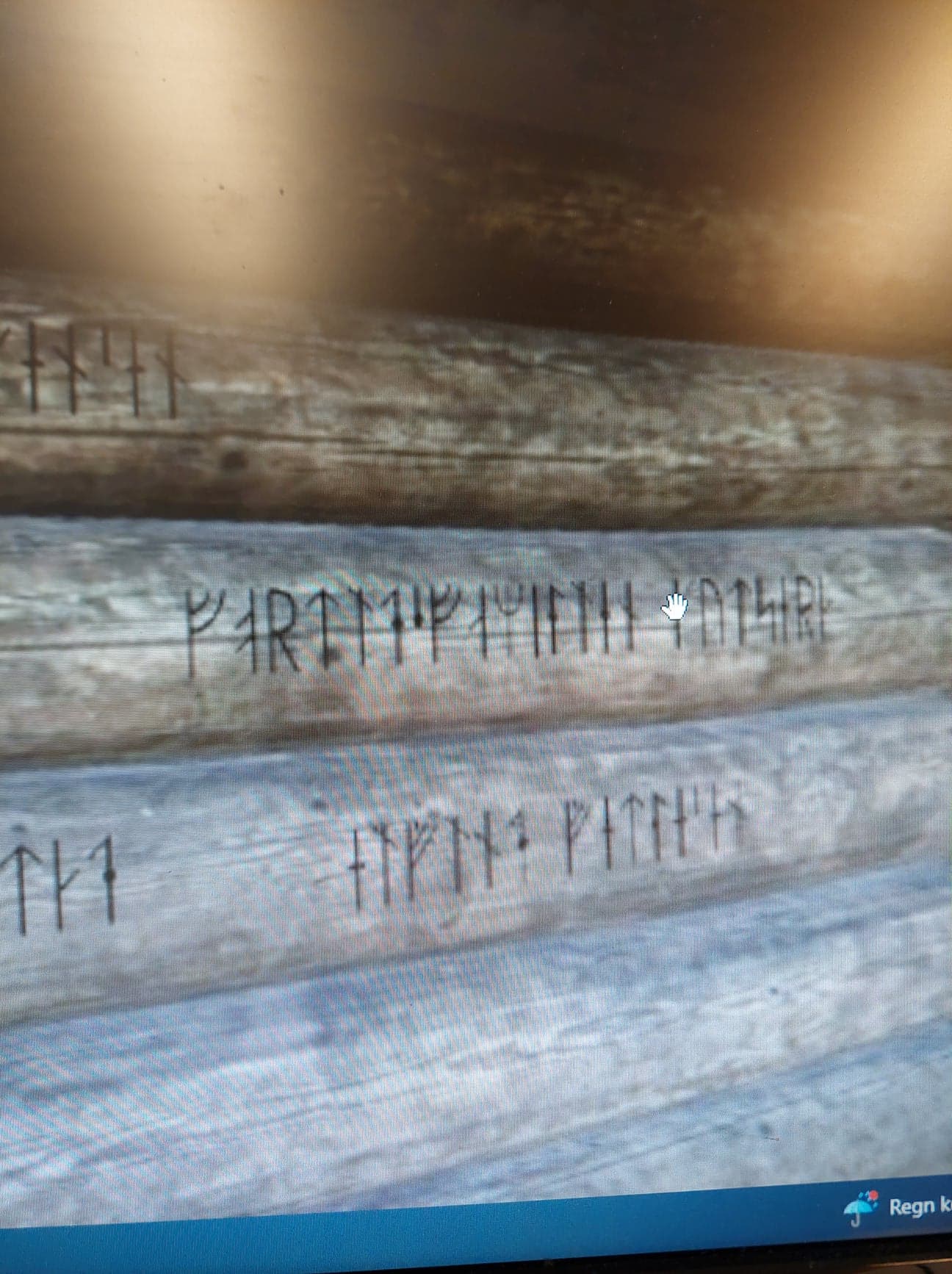 As thanks for small contributions, we and many others have had our name tagged in runes on the medieval buildings in streets and alleys. We took a walk through Bispeallmenningen (the Bishops Alley), one of Oslo’s most prominent streets in medieval times, and suddenly our tagging appeared. We found our name on the wall where a woman walks carrying water buckets.