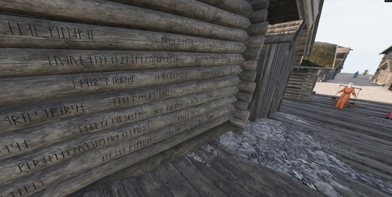 Som takk for små bidrag har vi og mange andre fått navnene tagget i runer på middelalderbygningene i gater og smau. Vi tok en digital vandring gjennom Bispeallmenningen, som var en av Oslos viktigste gater i middelalderen, og plutselig dukket vår tagging opp. Vi fant vårt navn på veggen der en kvinne går og bærer vannbøtter i et åk.
