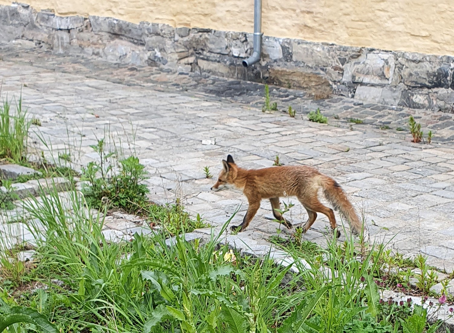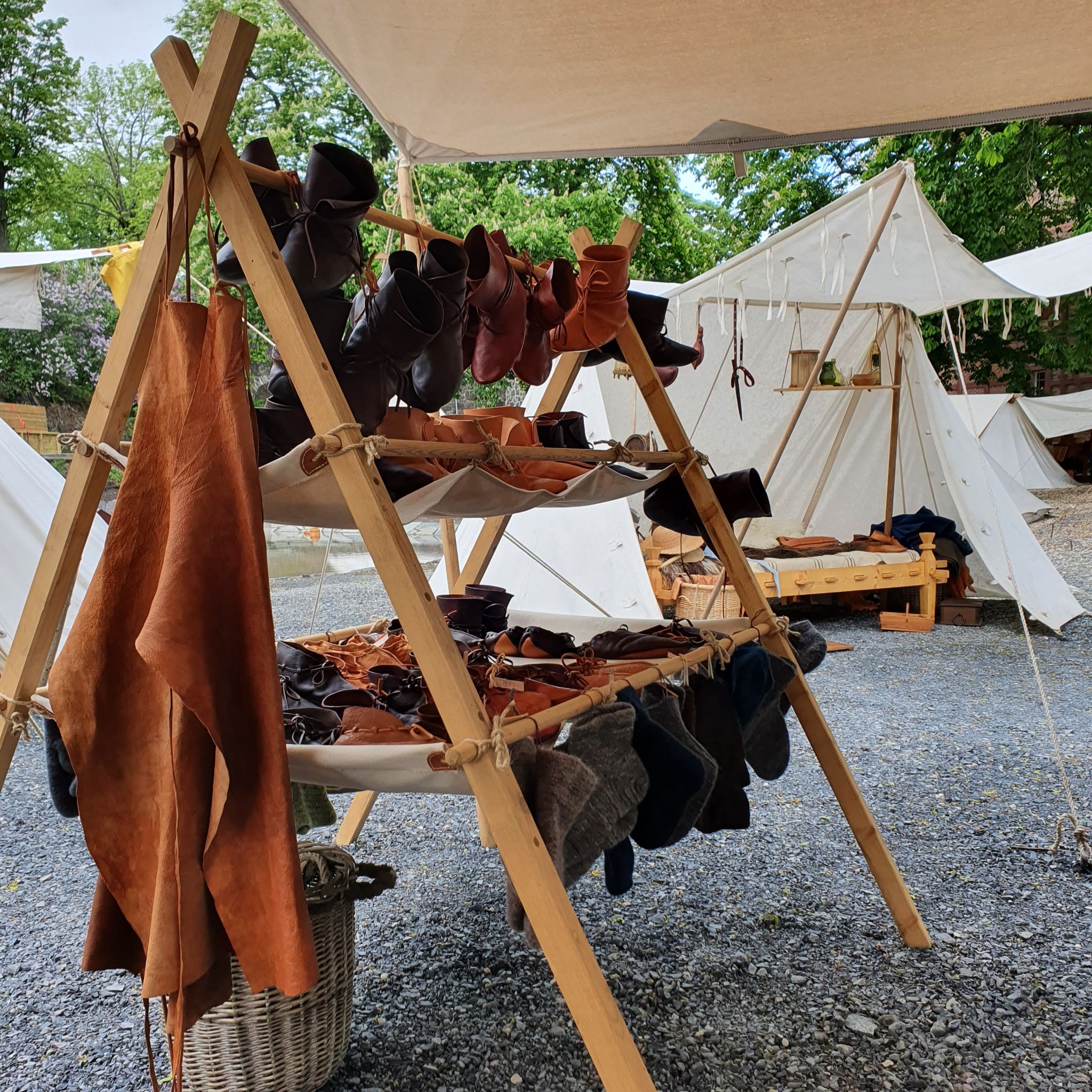 We set up a big and nice camp together with our friends, and had a great long weekend. As usual, we sold shoes and other leather goods, needle-bound socks and mittens. Although Espen had his full time serving customers, he also managed to demonstrate and communicate about the shoemaking craft. He also gave a lecture on the medieval shoemakers in Oslo and Bergen on Thursday evening. Lena did activities together with the others in the team, such as sewing leather purses, carving rune sticks and braiding ribbons. It was a particularly nice and social trip, and the food that Kristin from Handverkslaget conjured up made the stay at the festival a very special experience. And then there was the fortress fox, who ran away with both shoes, bags and the meat for one of our dinners.