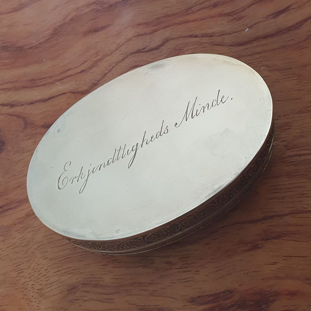 On the underside is engraved «Erkjendtlighets Minde» – to commemorate – an inscription that was used for gifts to civil servants, politicians or military officers in gratitude for their service. Unfortunately, the inscription doesn’t reveal who gave or received it. In any case, it must have been handed over sometime after February 1830, as thanks for an effort that preceded this. Both the donor and the recipient probably lived in Bergen, since the box is both produced and found here.