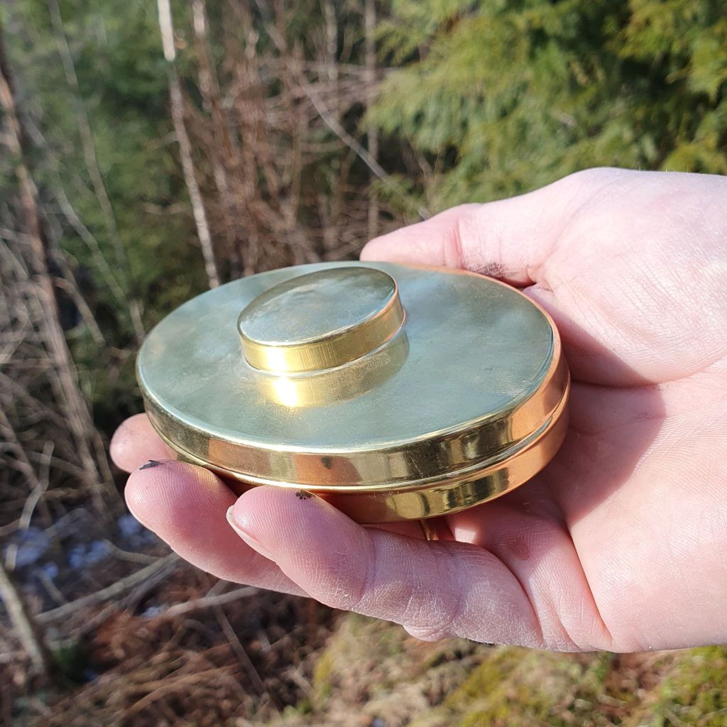 Although the box immediately gained a prominent place on a shelf in the living room, along with other small treasures, it somehow fell out of consciousness. Several years later, when we were looking for replicas for an outreach project, we came across «Tobacco Box with Burning Lens» on the website of Townsends, an American company that sells equipment for 18th-19th Century re-enactment. After some googling, we realized that these were very common to use in living history and bushcraft communities in the U.S. and Canada, manufactured and sold by many suppliers. They are copies of combined tinder and tobacco boxes with a burning lens, made of copper, brass or other copper alloys, which were originally sold by the British Hudson’s Bay Company in what is now Canada.