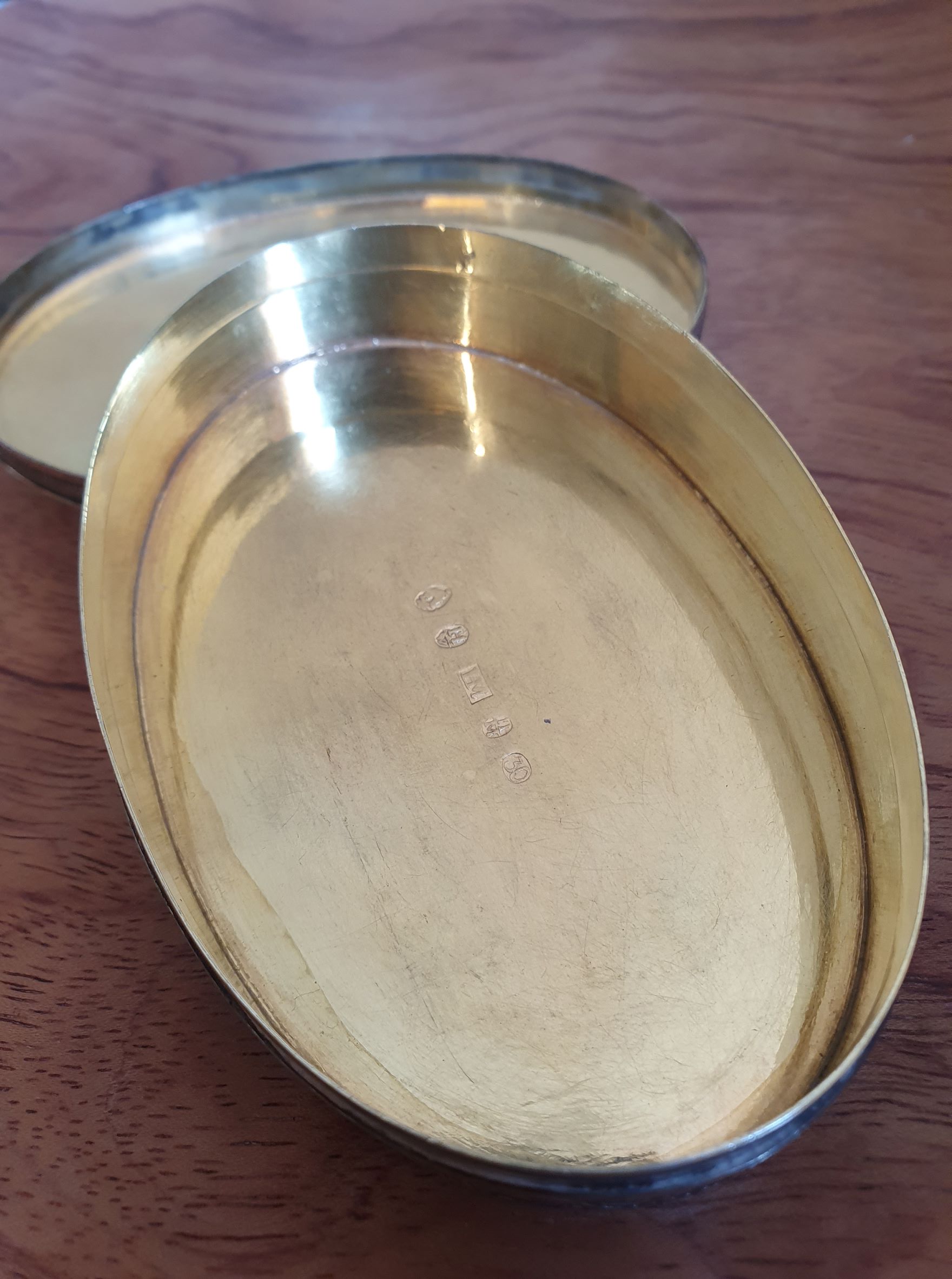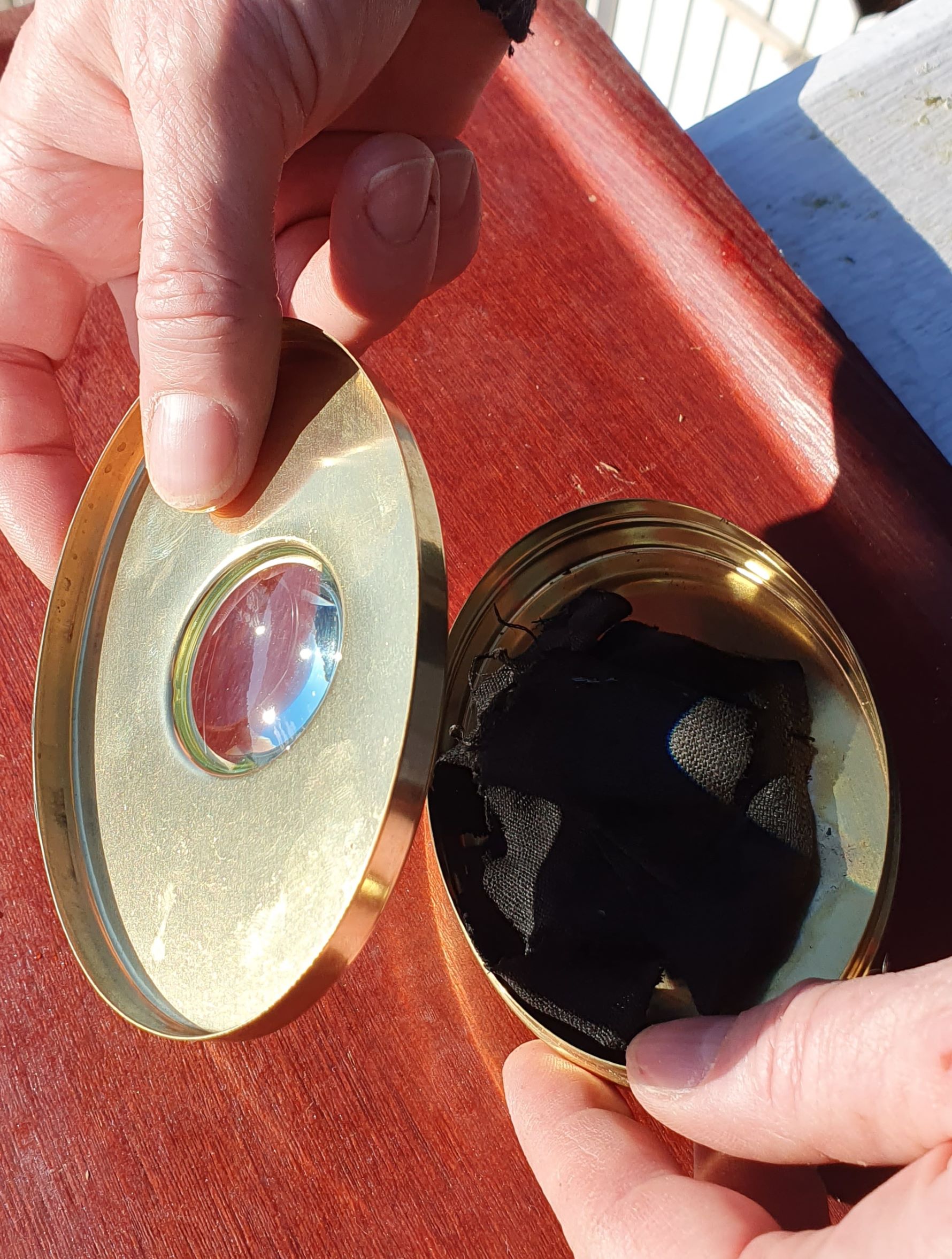 The box is gilded inside, which must have had something to do with what it was meant to contain. We assumed it was for tobacco since it seemed a little too big to be a snuff box. However, there was one detail we wondered about and didn’t figure out right away: it consists of a bottom and a lid, but in the middle of the lid is a smaller, round lid. In the opening below this there is mounted a glass lens.