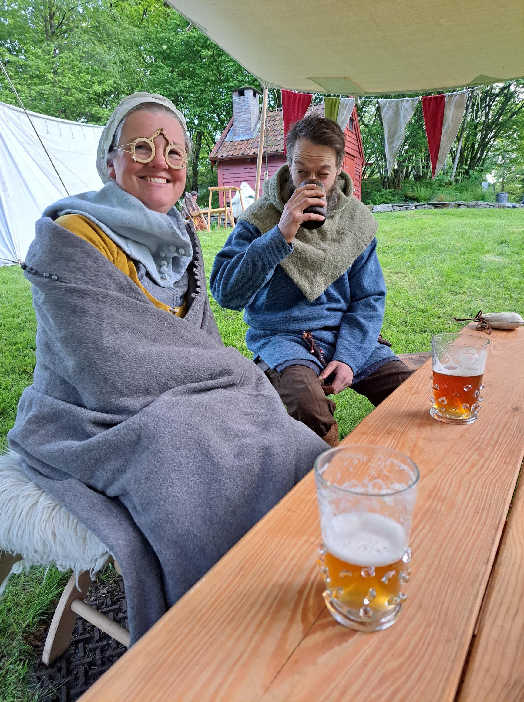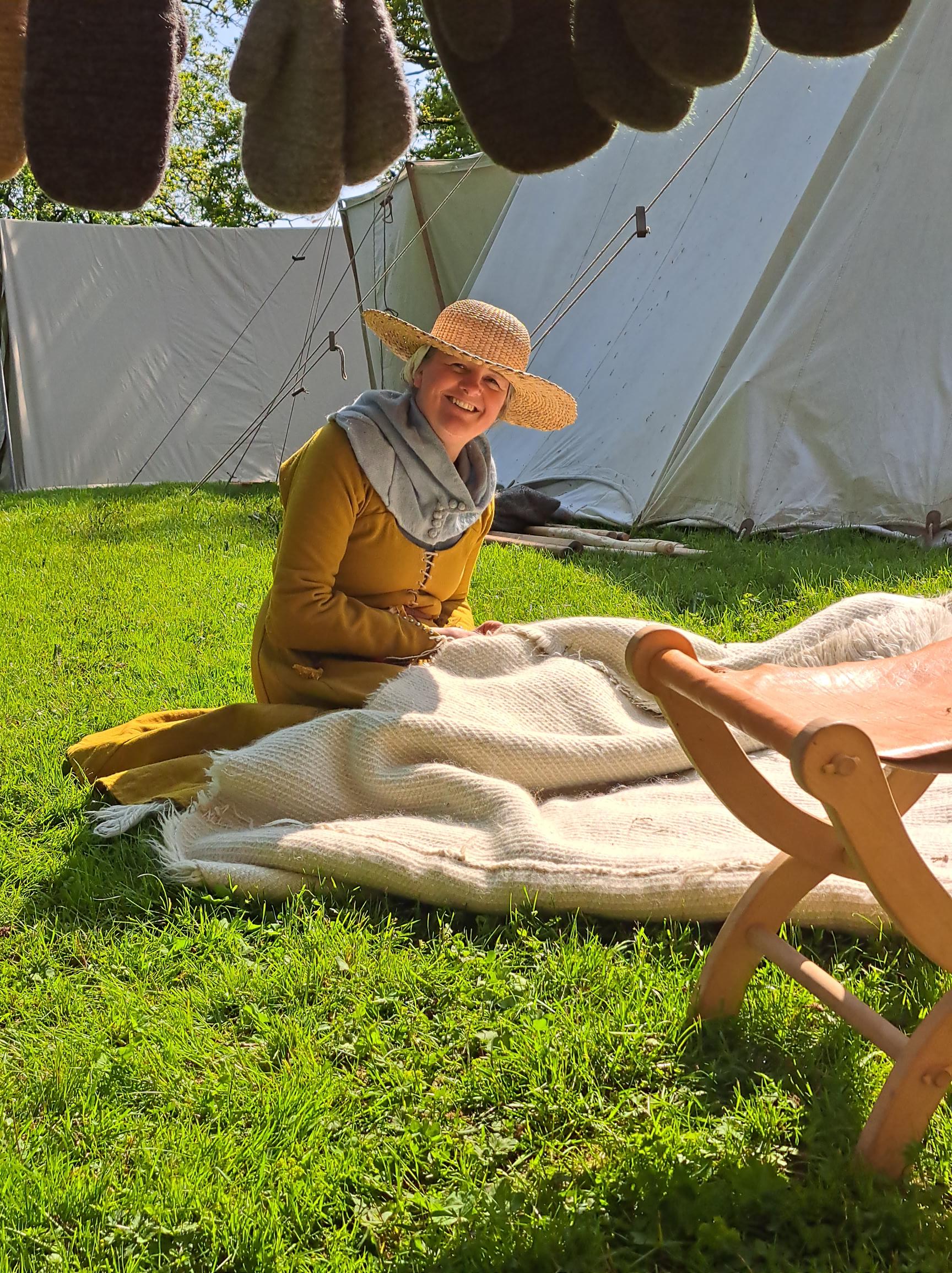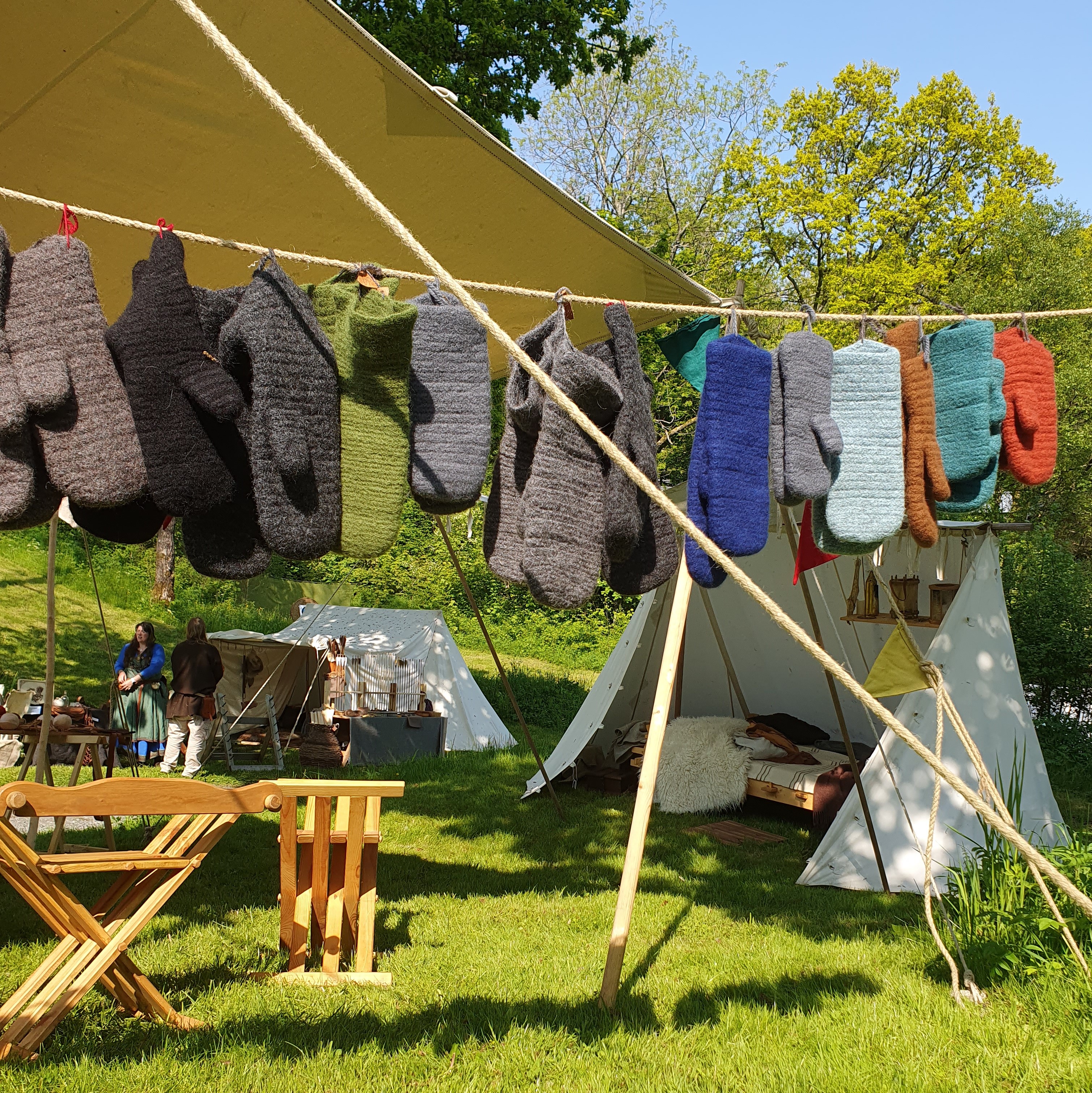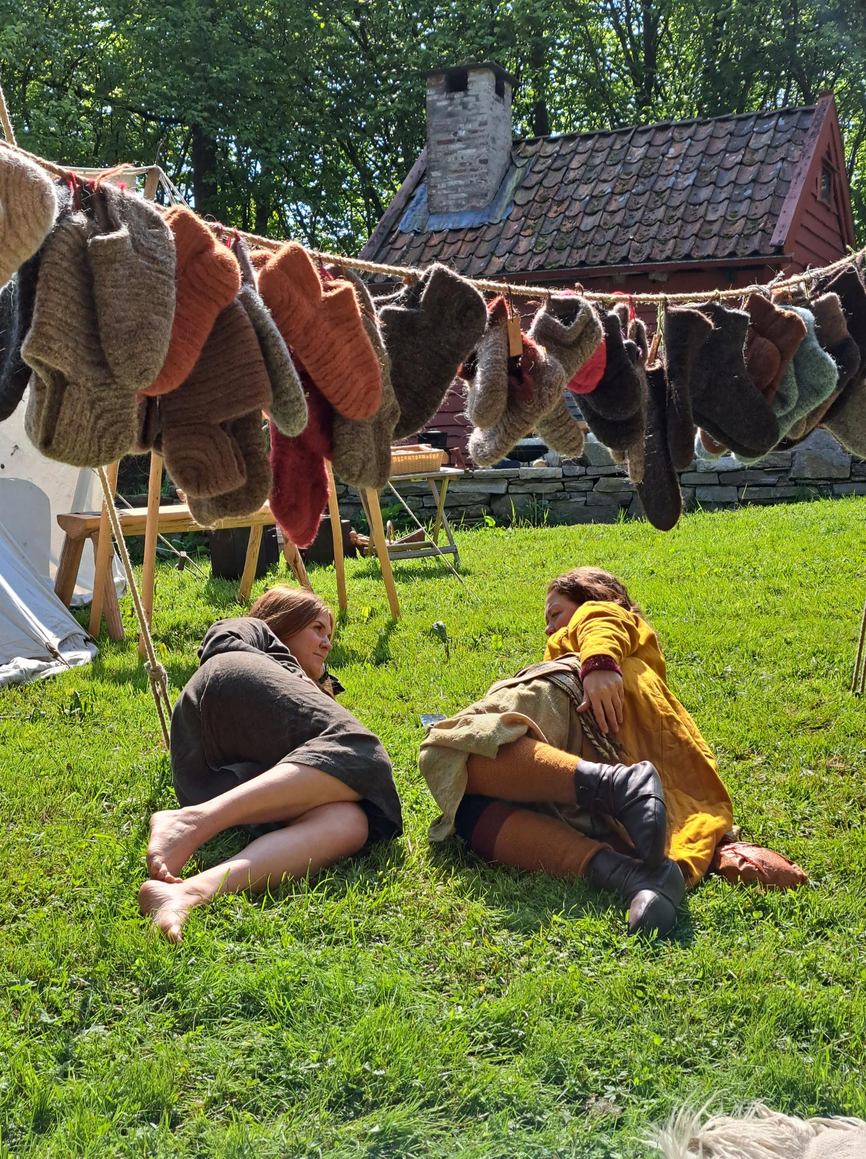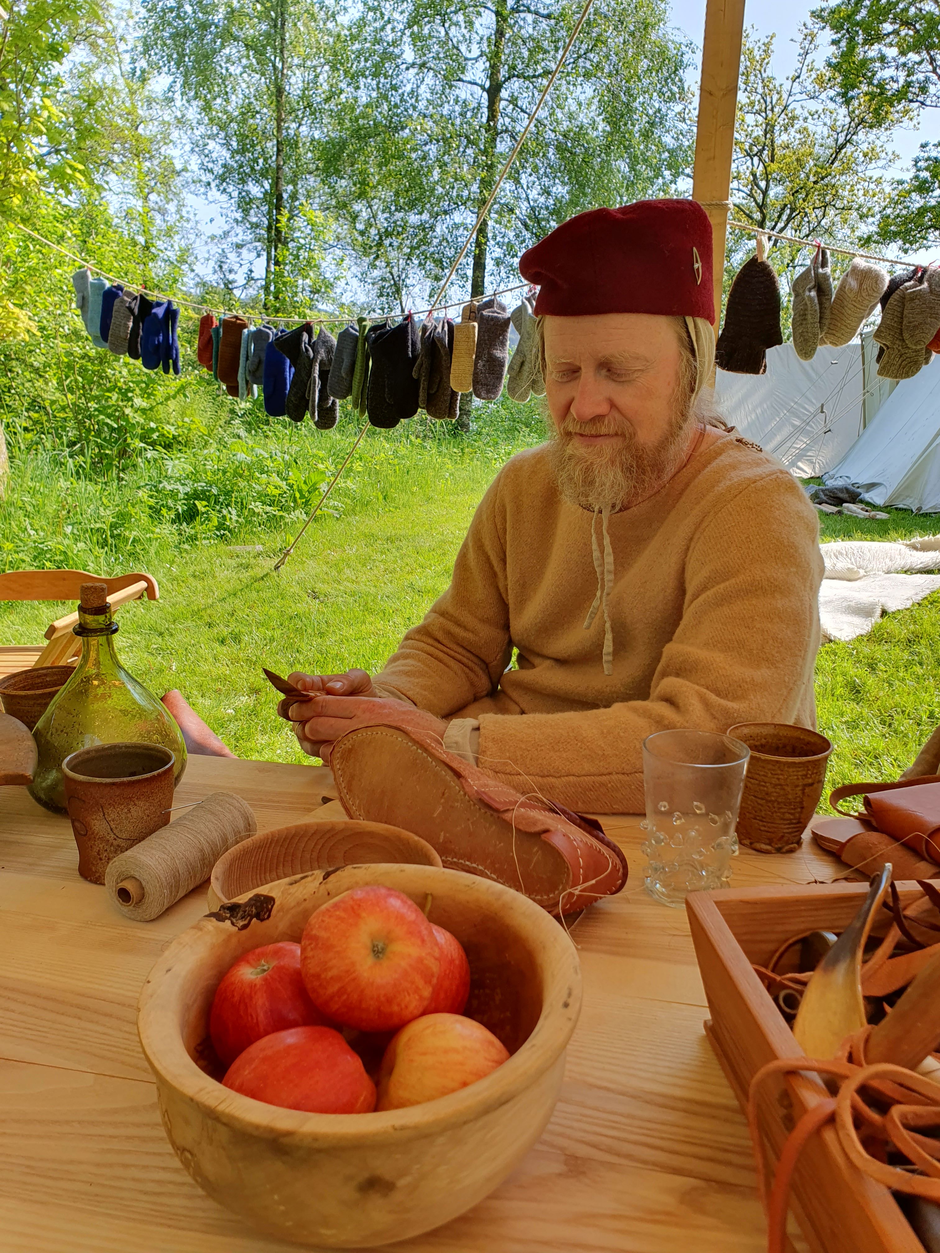 We didn’t have many shoes and socks left after Oslo Medieval Festival, but that didn’t matter much. We were not there to sell, but to enjoy the atmosphere and meet friends and acquaintances. Both of us have busy and long days at work this time of year, so we really need pit stops like this to recharge. Although Hordamuseet is Espen’s workplace, he relaxes well under such circumstances. We also had time to demonstrate some crafts, such as making shoes and needlebinding, and Lena got some sewing projects done. Although there were fewer sellers than usual, we also managed to find something to buy. You can never have enough stuff.