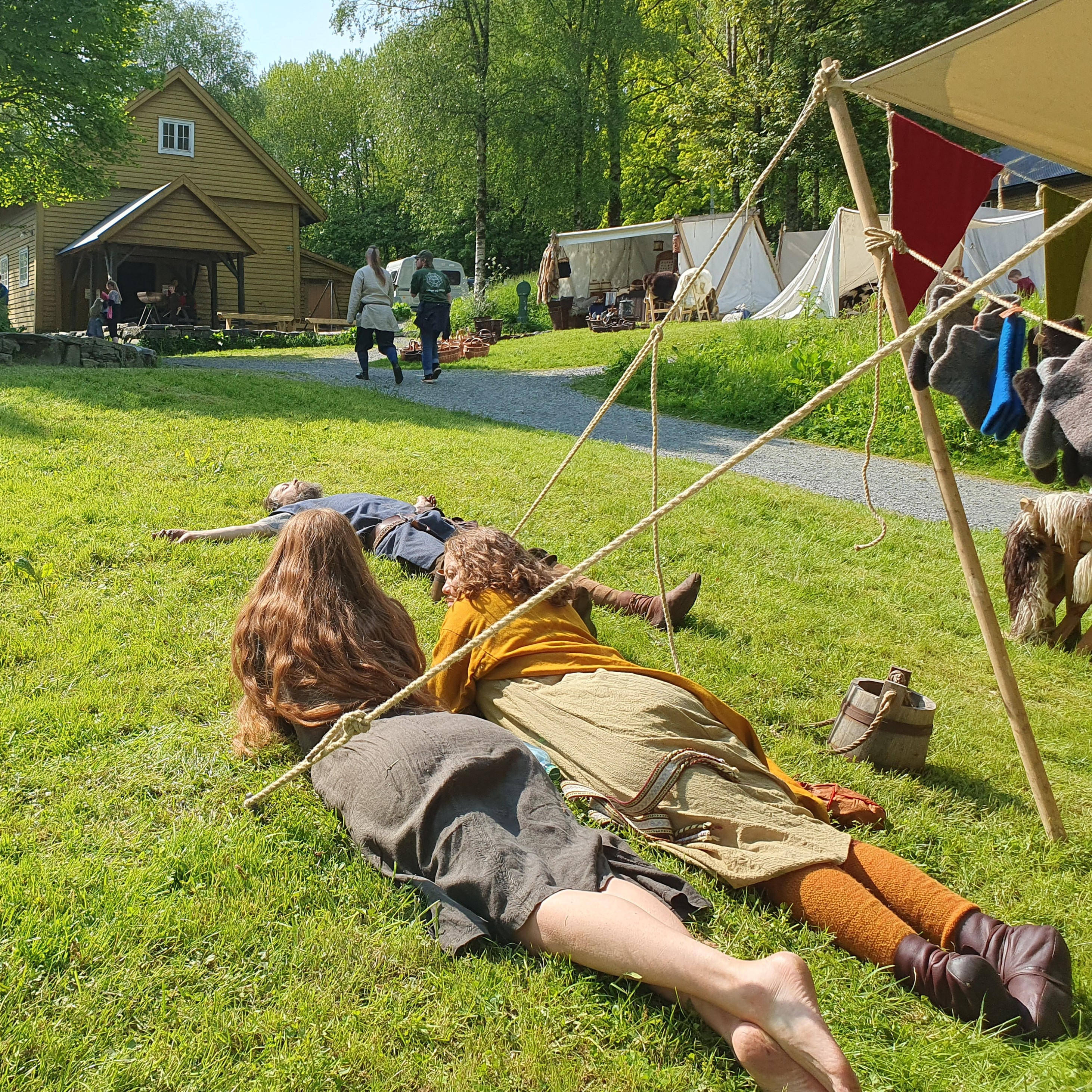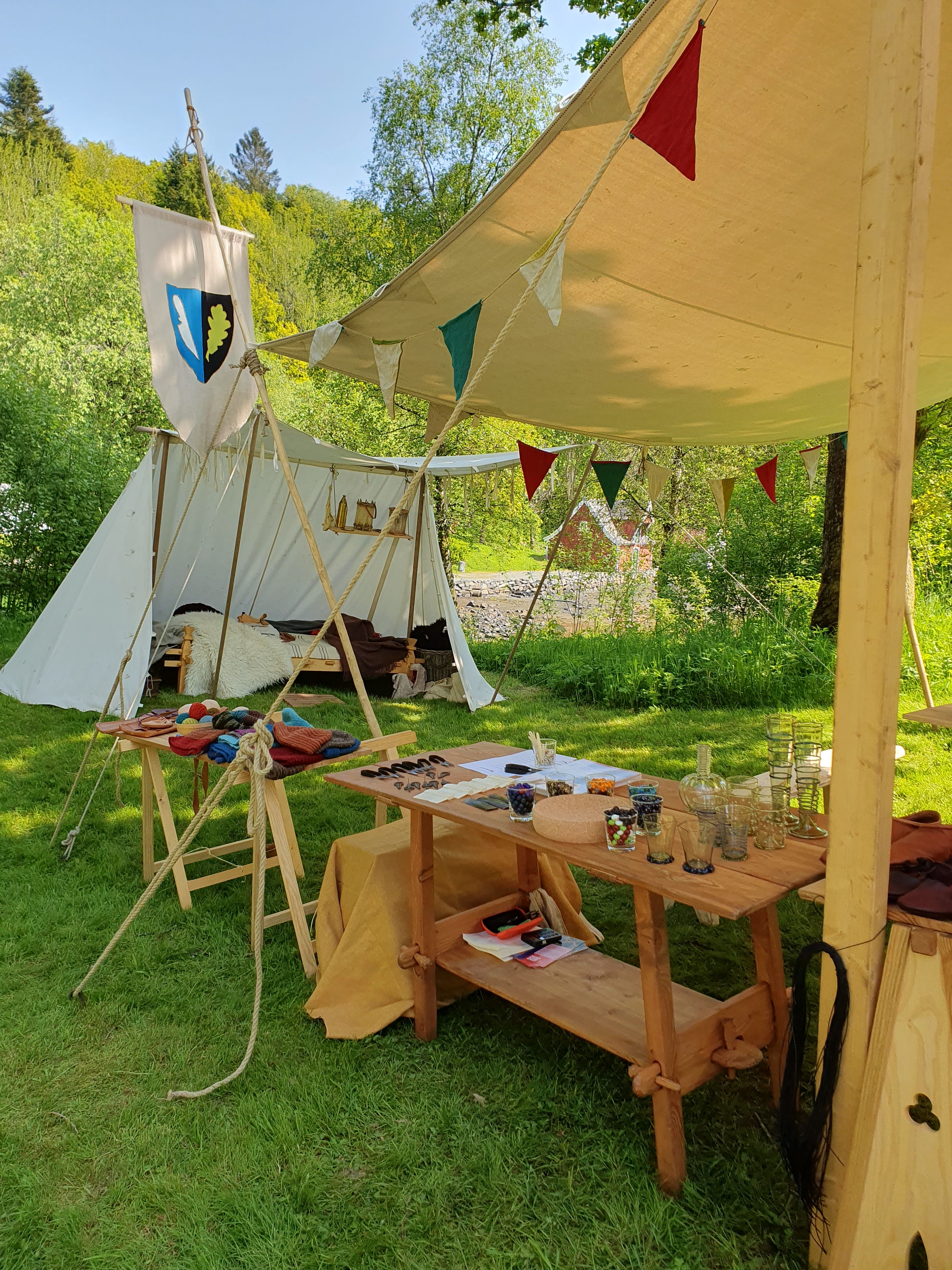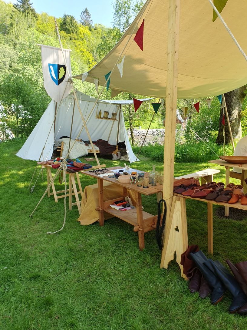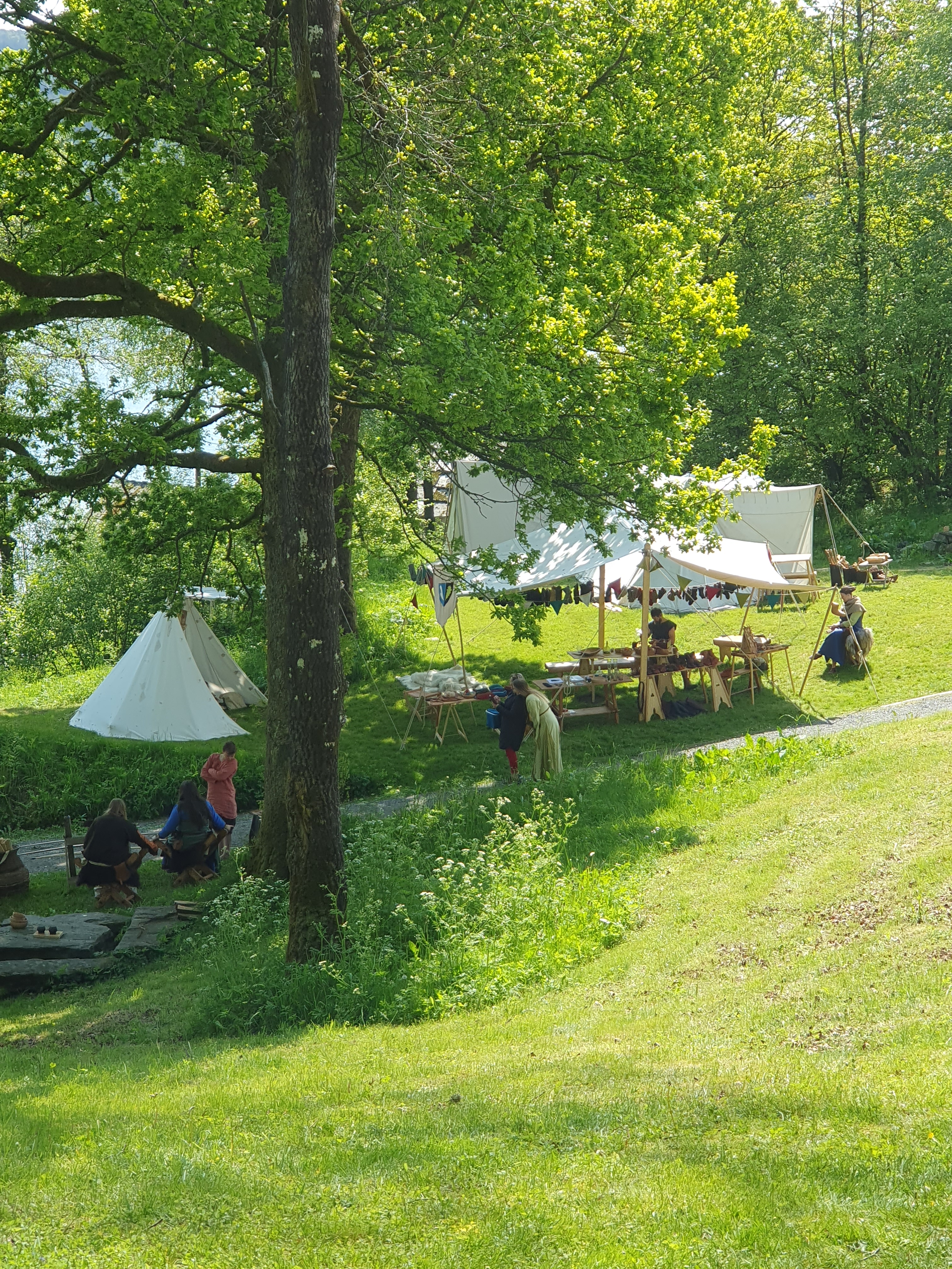 Vi hadde leir samme sted vi har pleid å holde til de siste årene, i skyggen av en stor eik. Været var strålende hele helgen, så det var godt med litt skjerming. Denne gangen var vi de eneste i Bjørgvin Handverkslag som teltet her, men flere av de andre var innom i løpet av helgen, både på dag- og kveldstid. Bymuseet hadde også en liten pop-up-museumsbutikk under solseilet vårt på lørdagen, noe som med fordel kan gjentas i årene som kommer.