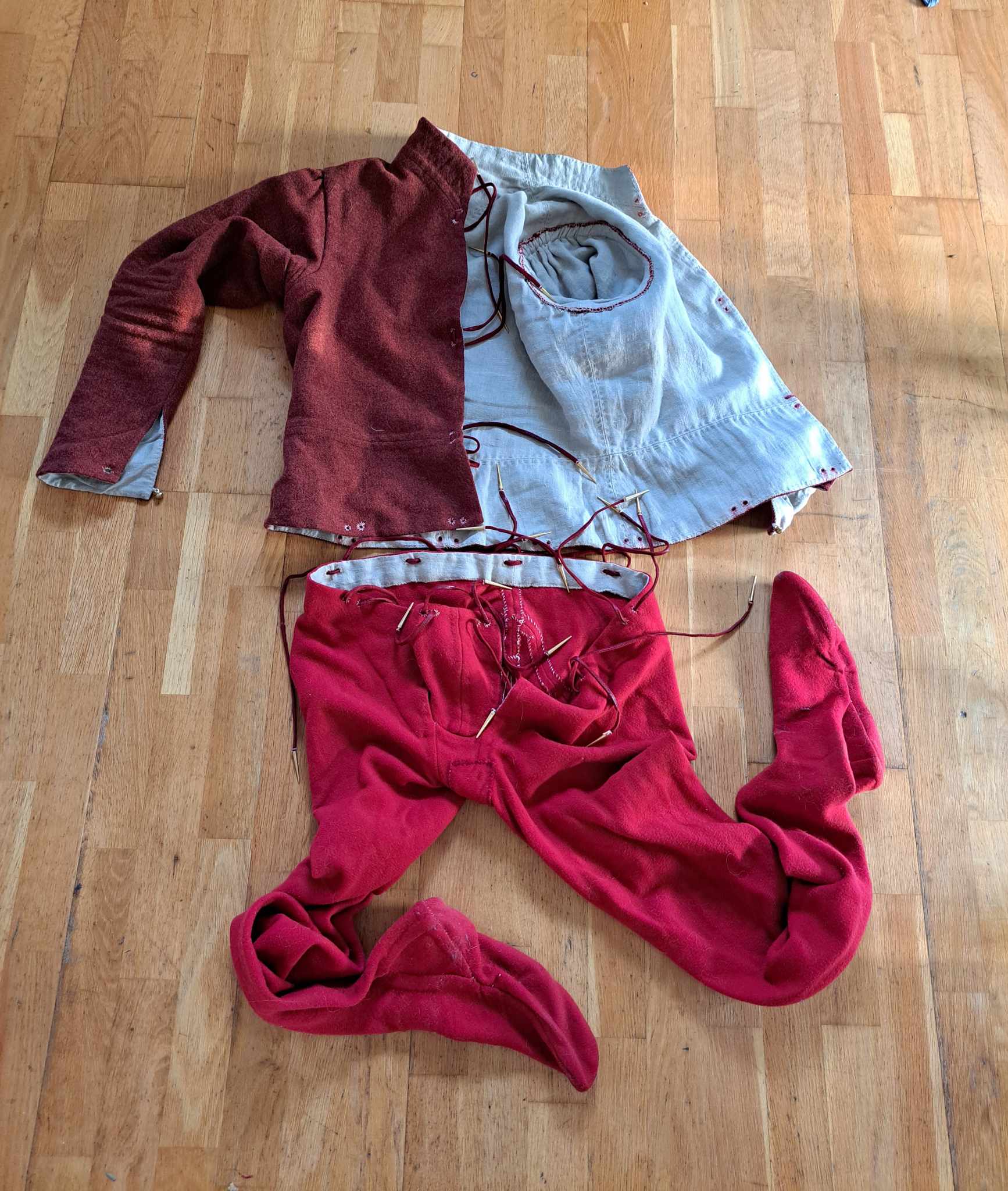 Til nå har vi – innen middelalderen – prioritert tiden frem til ca. 1350, og kan gå av på flere stoppesteder med tidsmaskinen. Deretter endrer imidlertid klesmotene seg mye. Det betyr at vi måtte starte omtrent fra bunnen av. Det har gått med ikke så reint lite tid til å lage nye klær, ved siden av travle jobber og forberedelser til Oslo Middelalderfestival og Bjørgvin Marknad. Det har blitt en del prøving og feiling før vi var fornøyd med mønstre og passform, men det har kommet seg etter hvert. I Oslo fikk vi testet ut noen av 1400-tallsklærne, selv om garderoben var langt fra ferdig. Nå har vi trappet opp syingen, og håper å bli ferdig med det meste vi hadde planer om før deadline 20. juli.