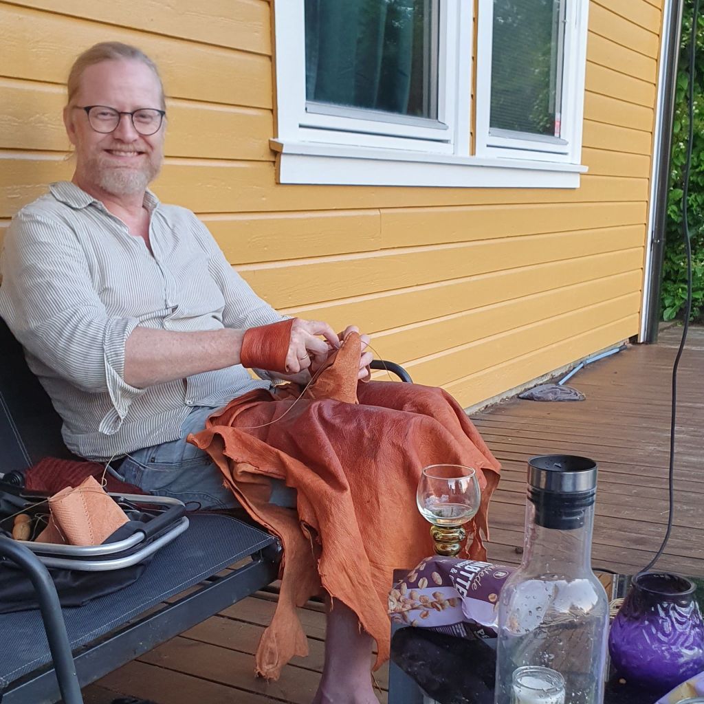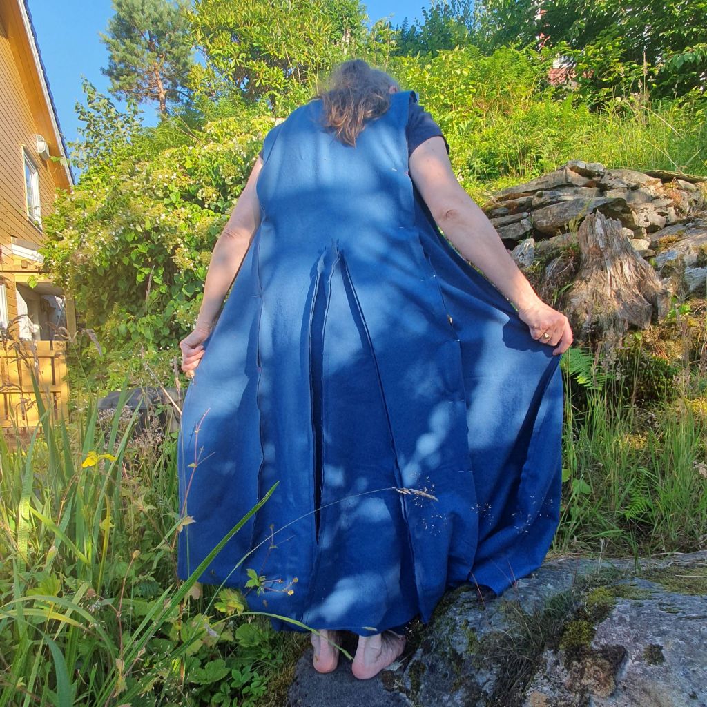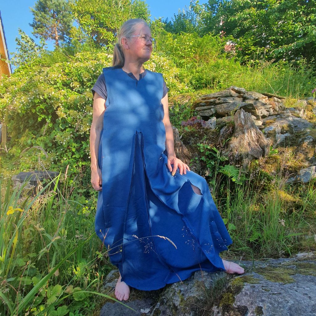 After Oslo and Hamar, Espen has spent every available moment to make new shoes, and every cup of coffee is enjoyed with needlebinding in hand. Lena is not quite as efficient, and has had many long work days and evenings this spring and summer. She has still had some time for handwork anyway, it is difficult to avoid. We have both got ourselves new linen work aprons. We also bought fabric to sew a new dress for Lena. It will be a Greenland-style overdress.